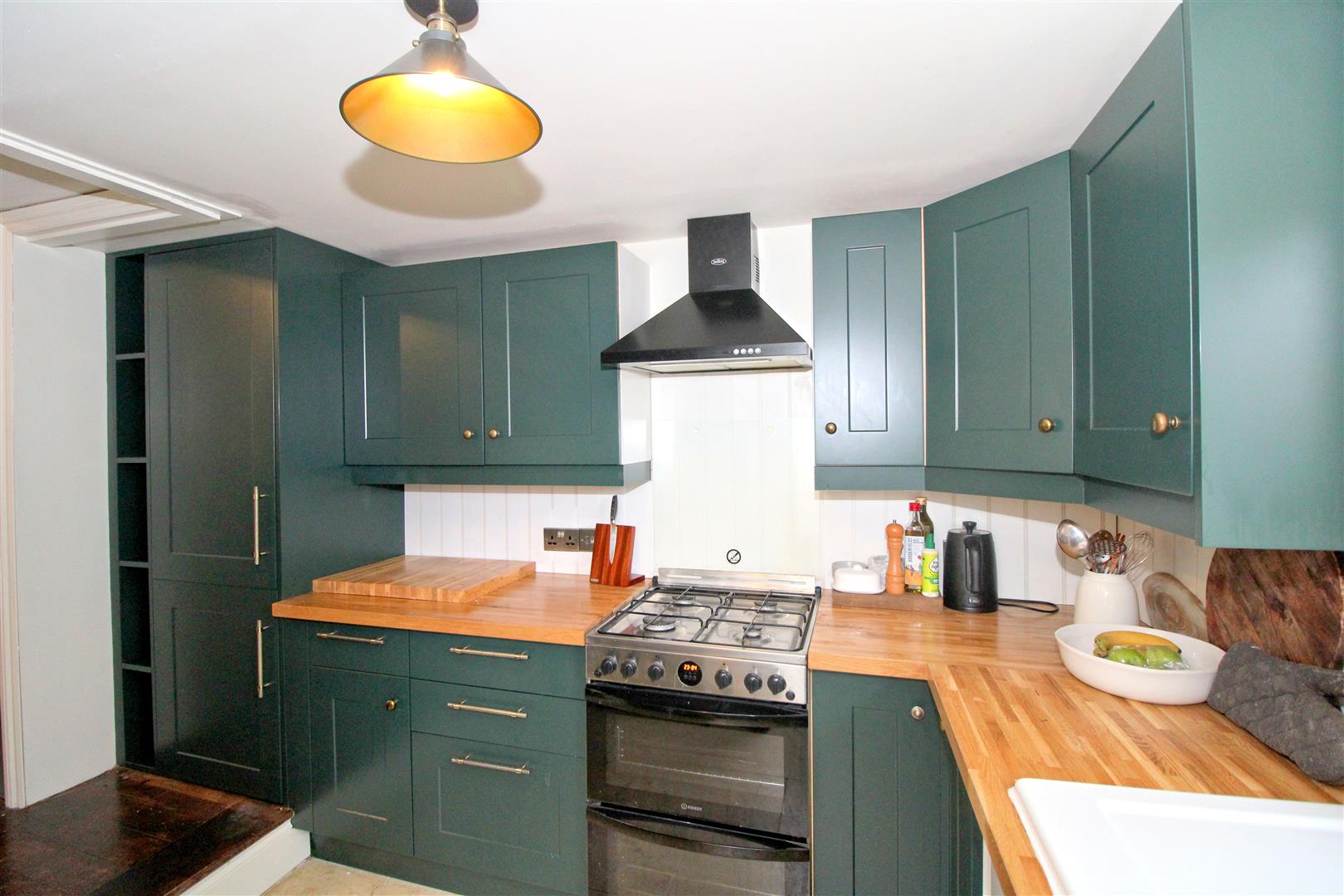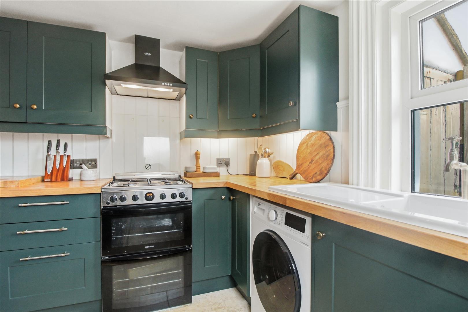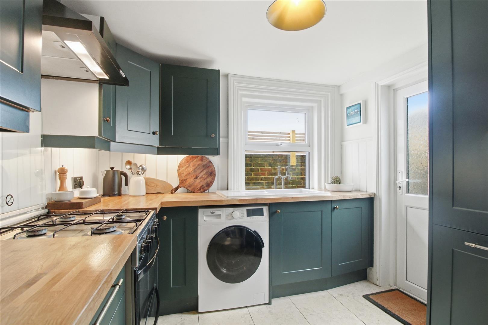 Modern fitted kitchen with a range of forest green base and wall units. Integrated fridge, freezer and dishwasher. Work surface with sink and drainer. Window to rear. Door out to patio area. Cupboard housing gas boiler and gas meter. Space for gas cooker with cooker hood above and washing machine.