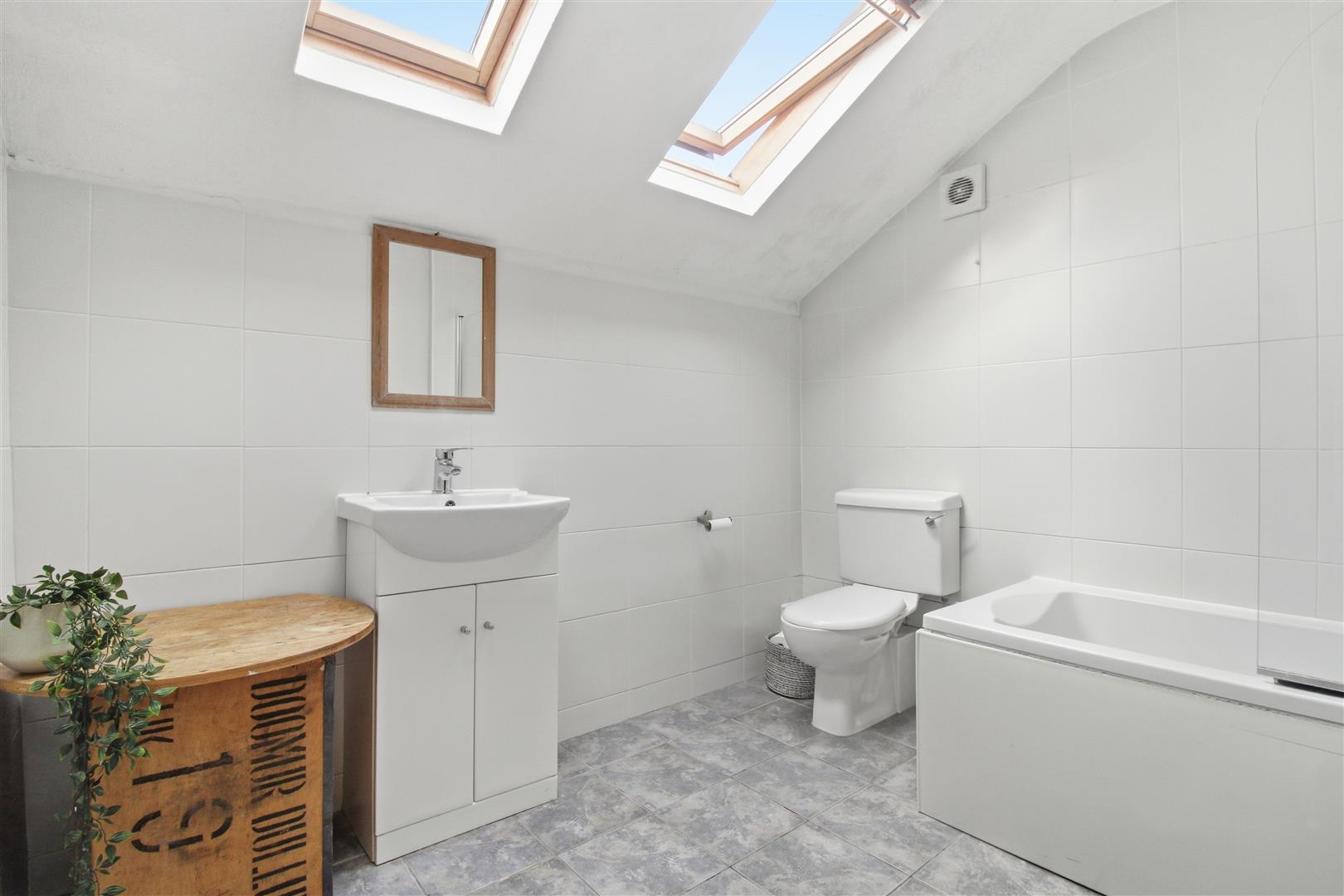 Panelled bath with shower above. WC. Wash basin with storage beneath. Heated towel rail. Extractor fan. Tiled walls. Velux style window.