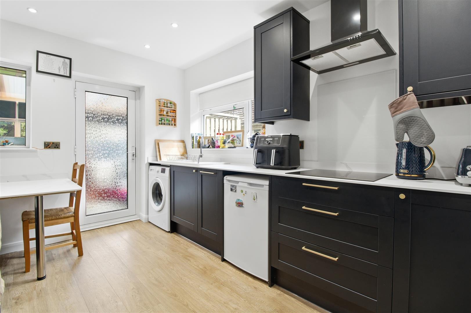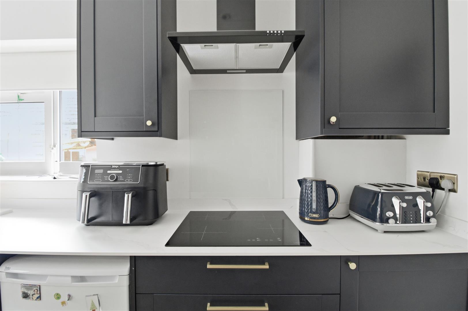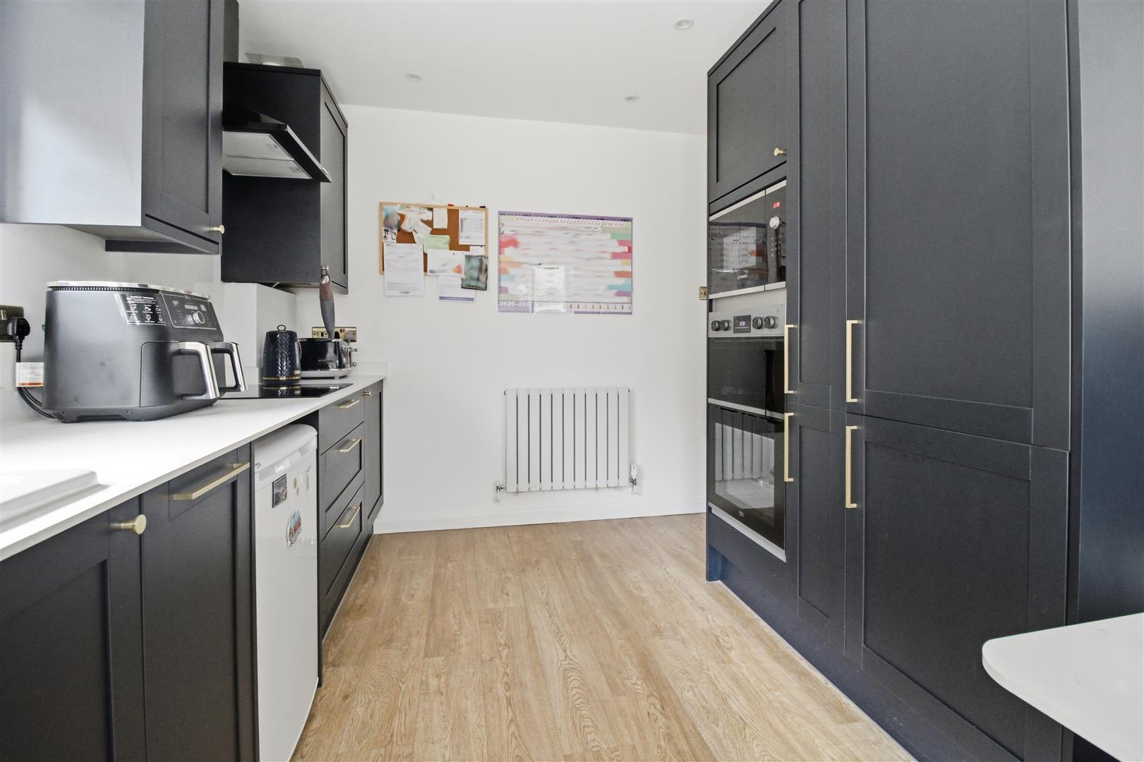 Selection of wall and floor cabinets. Four ring induction hob with cooker hood above. Built in microwave and double oven. Work surface with sink and drainer. Integrated fridge freezer and space for dishwasher and washing machine. Windows to the side. Window and door into the conservatory. Space for breakfast table with seating area. Spot lighting. Radiator. Worcester-Bosch gas fired boiler.