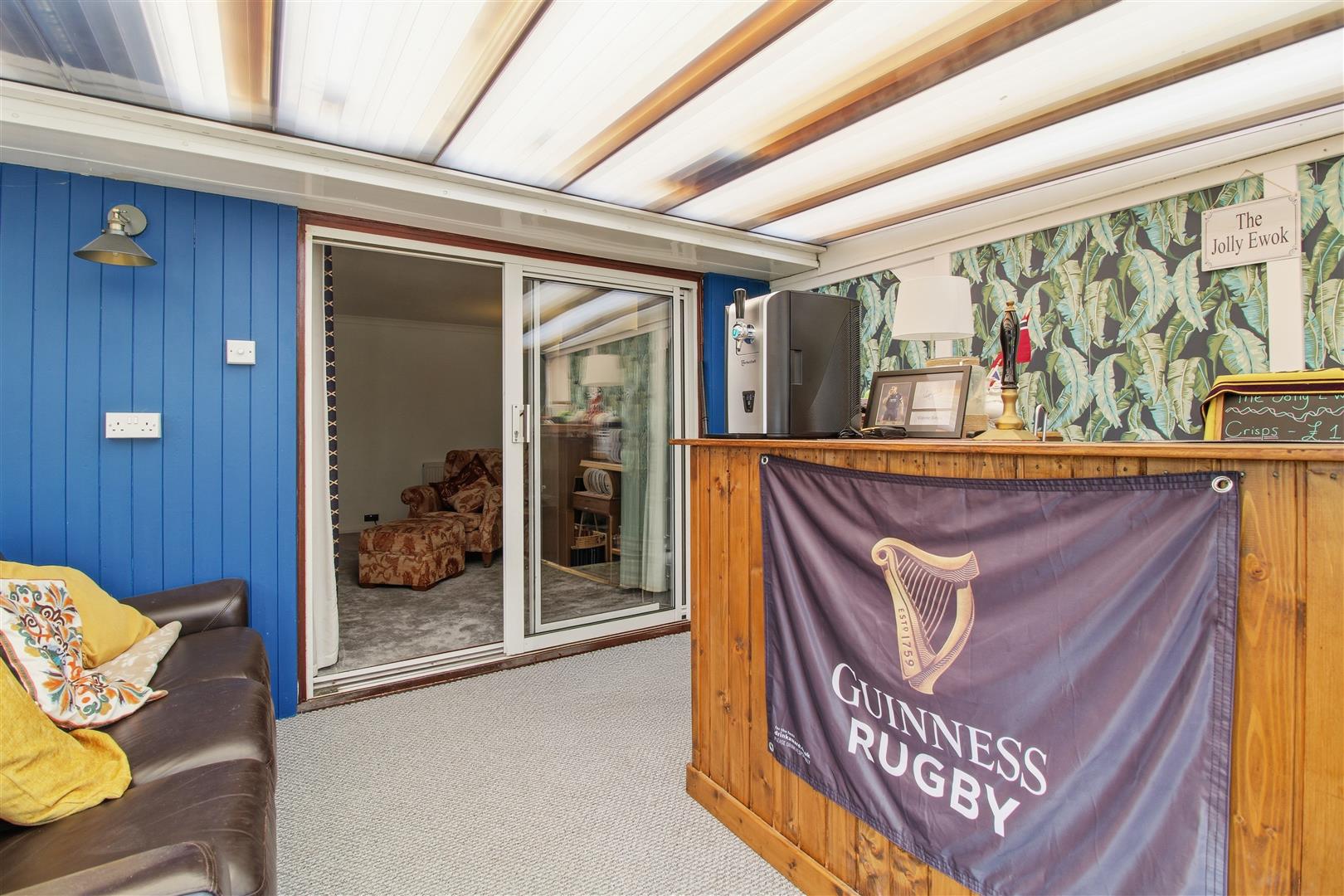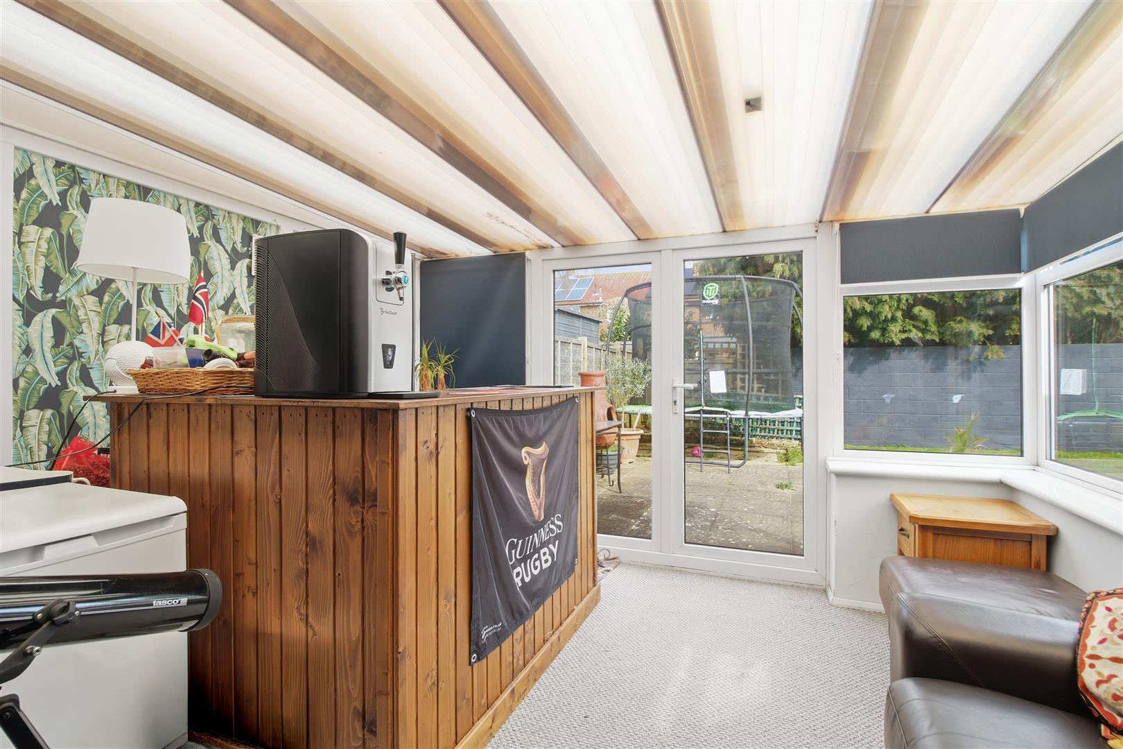 Conservatory split into two sections via double doors. Double glazed. Radiator. Power and lighting. Door leading into the kitchen. Door on the side into the garden. Further double doors leading to garden.
