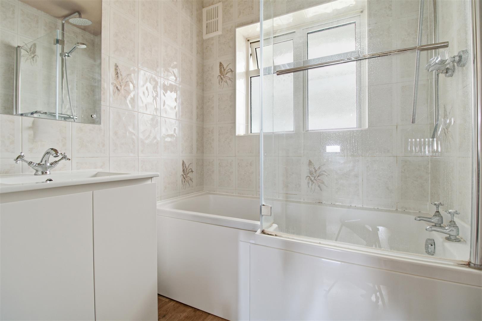 Wash hand basin with storage cupboard underneath. P-shaped bath with dual shower head attachment above. Obscure glass window to the rear into conservatory. Wall mounted mirror. Heated towel rail.