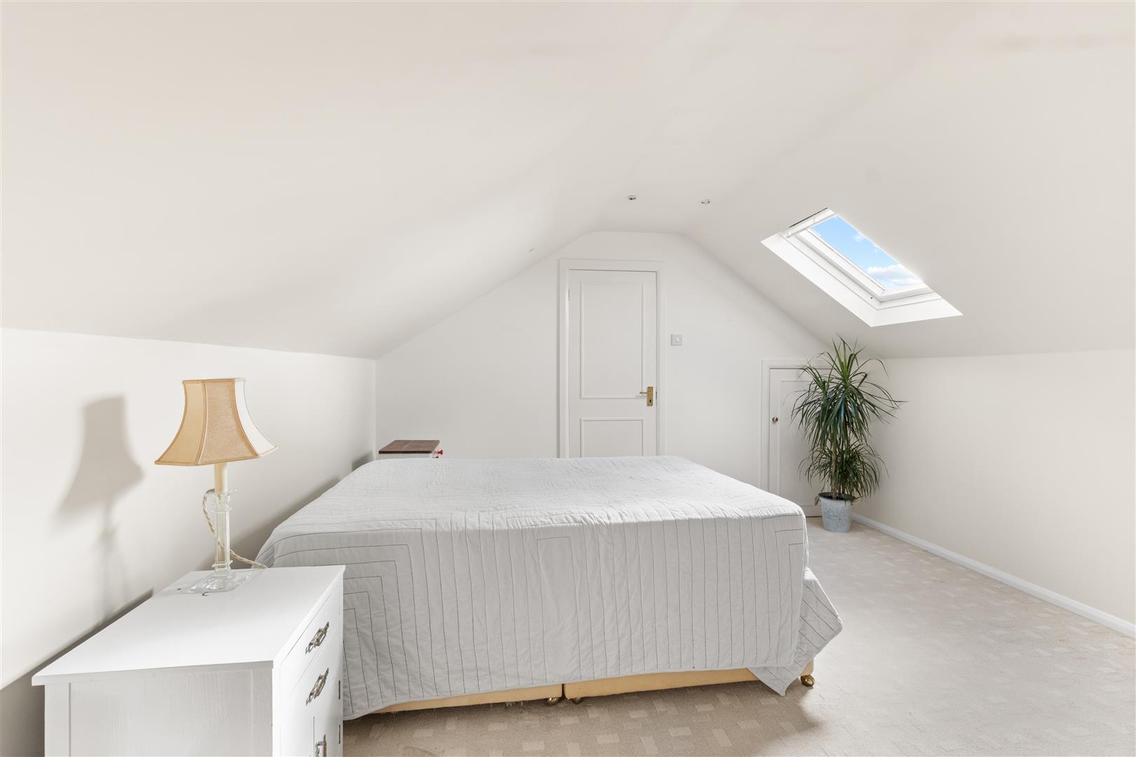 Rear aspect dormer window, eaves storage (housing boiler), door to en-suite with shower cubicle, low suite WC, pedestal wash basin, side window.
