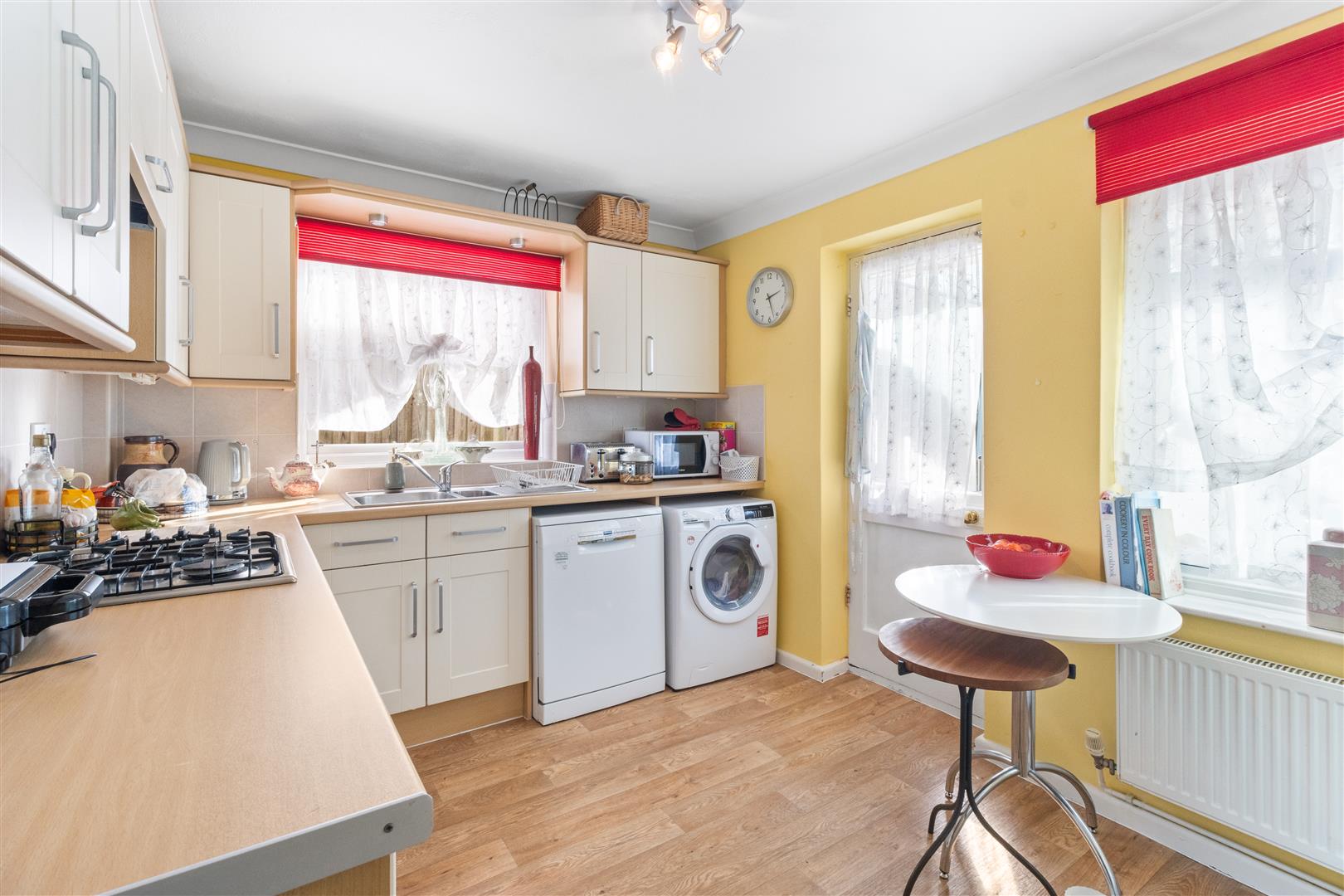 Range of fitted wall and base units, works surfaces with inset sink, built-in oven, hob and extractor hood, space for appliances, side and rear windows, door to conservatory.