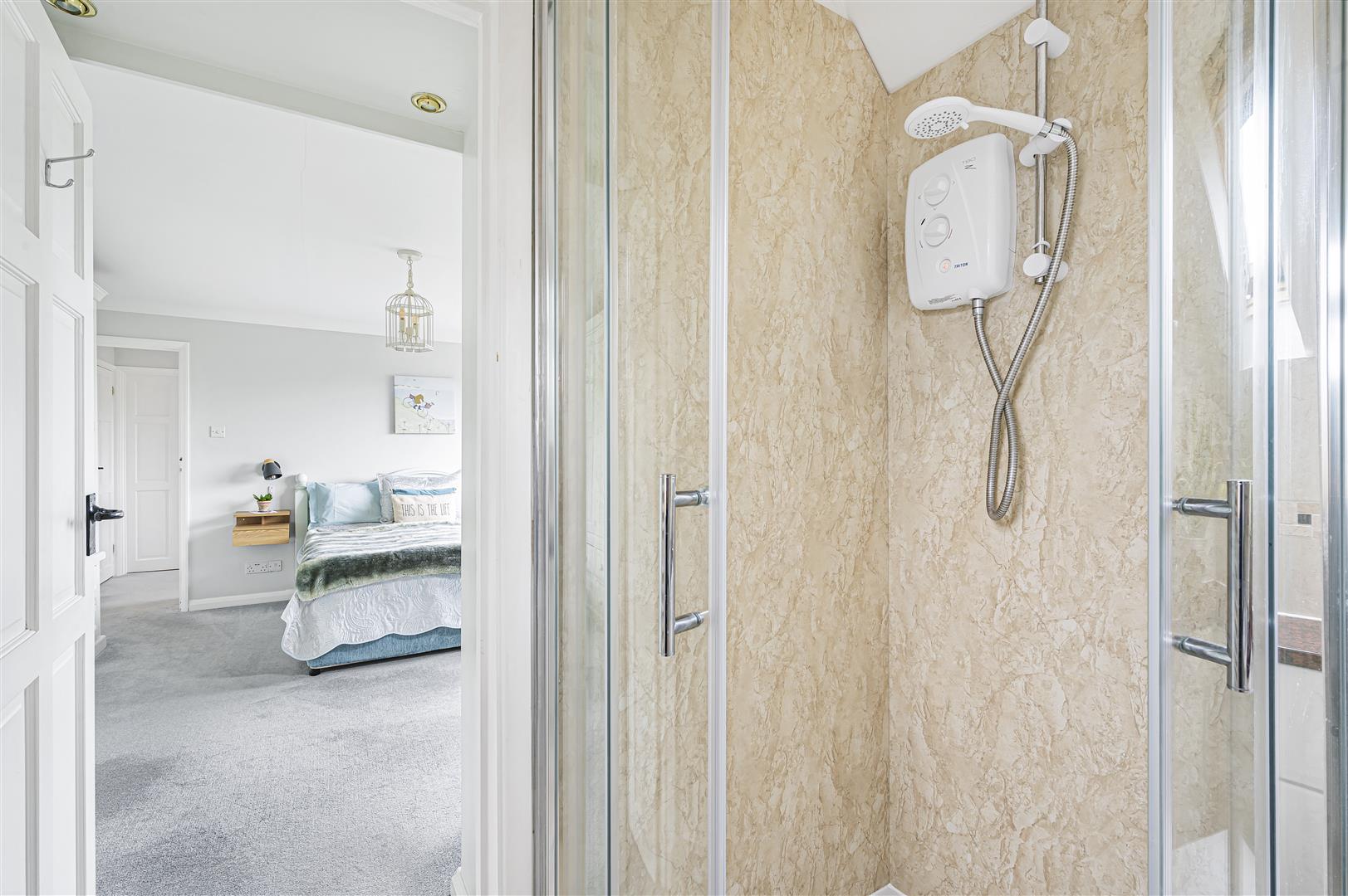 White suite comprising bath, close coupled WC with concealed cistern. Wash basin set into vanity unit with mirror above. Shower enclosure with Mira electric shower. Tiled walls and floor. Double glazed window to rear.