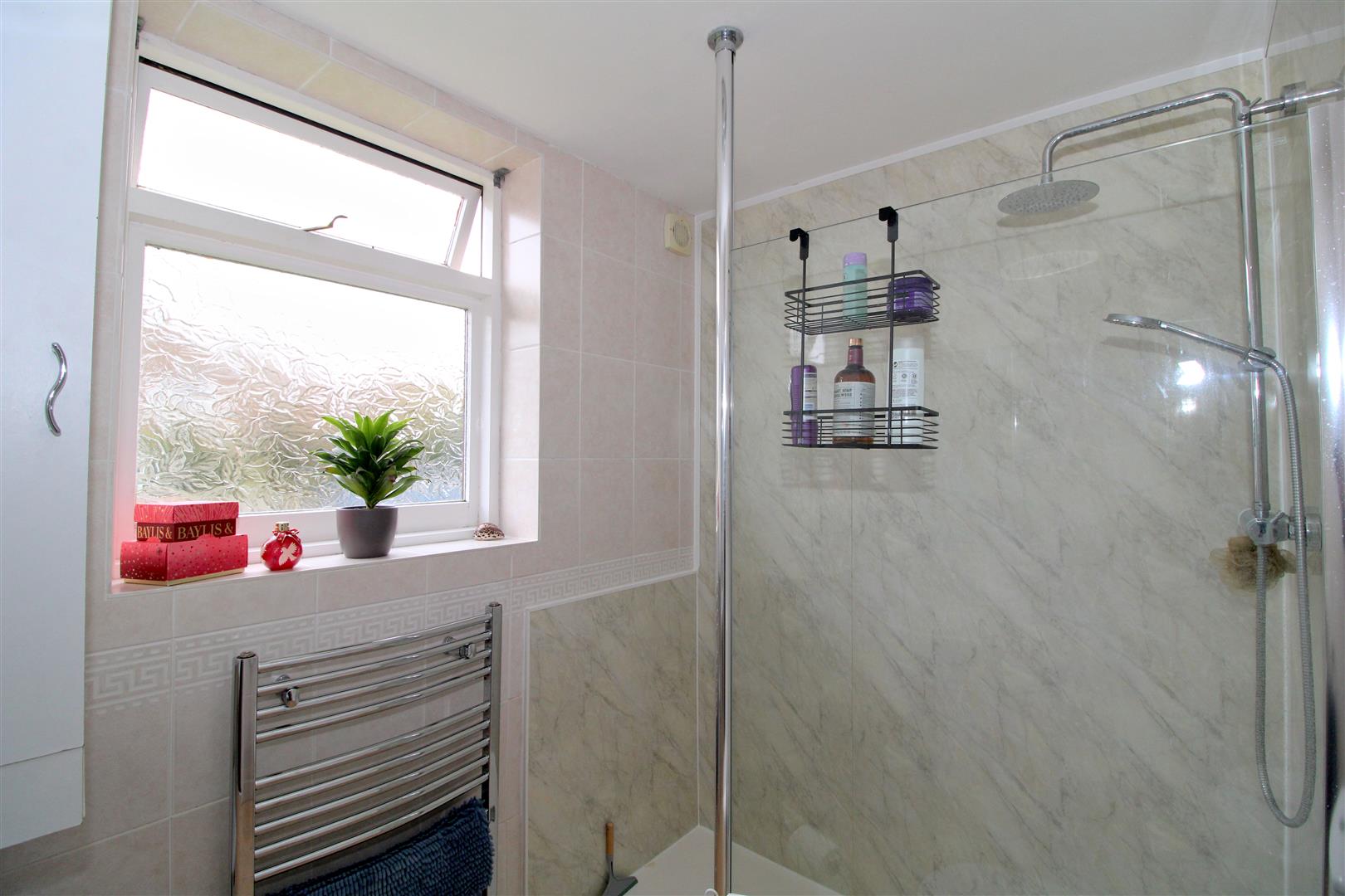 Walk-in shower. W.C. Wash basin. Heated towel rail. Cupboard housing wall-mounted Vaillant gas boiler. Obscured window. Tiled walls. Extractor fan.