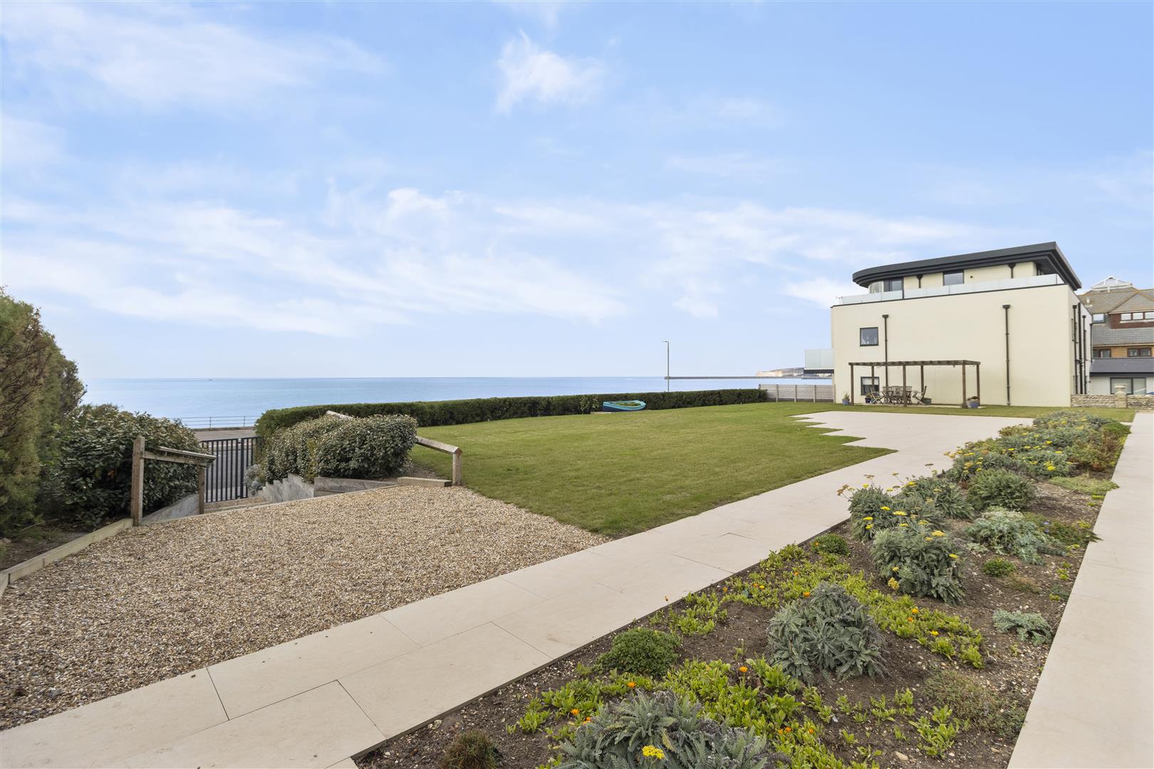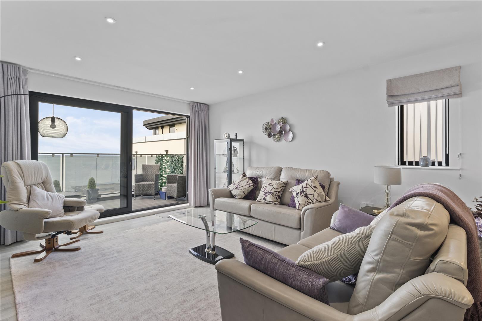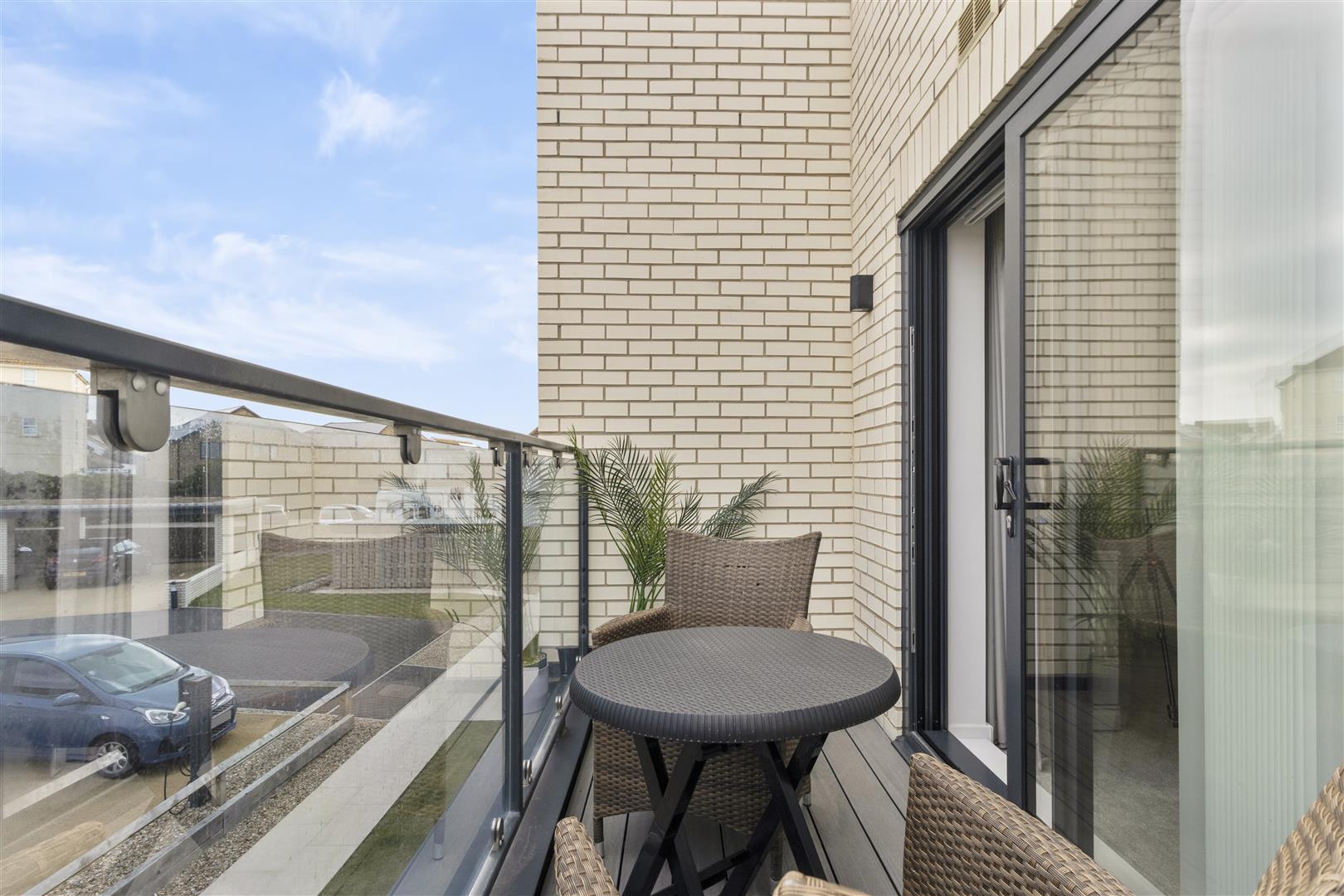 Expansive views across the communal gardens to the sea. Curved tinted glass balustrade. Space for outdoor dining table and chairs.