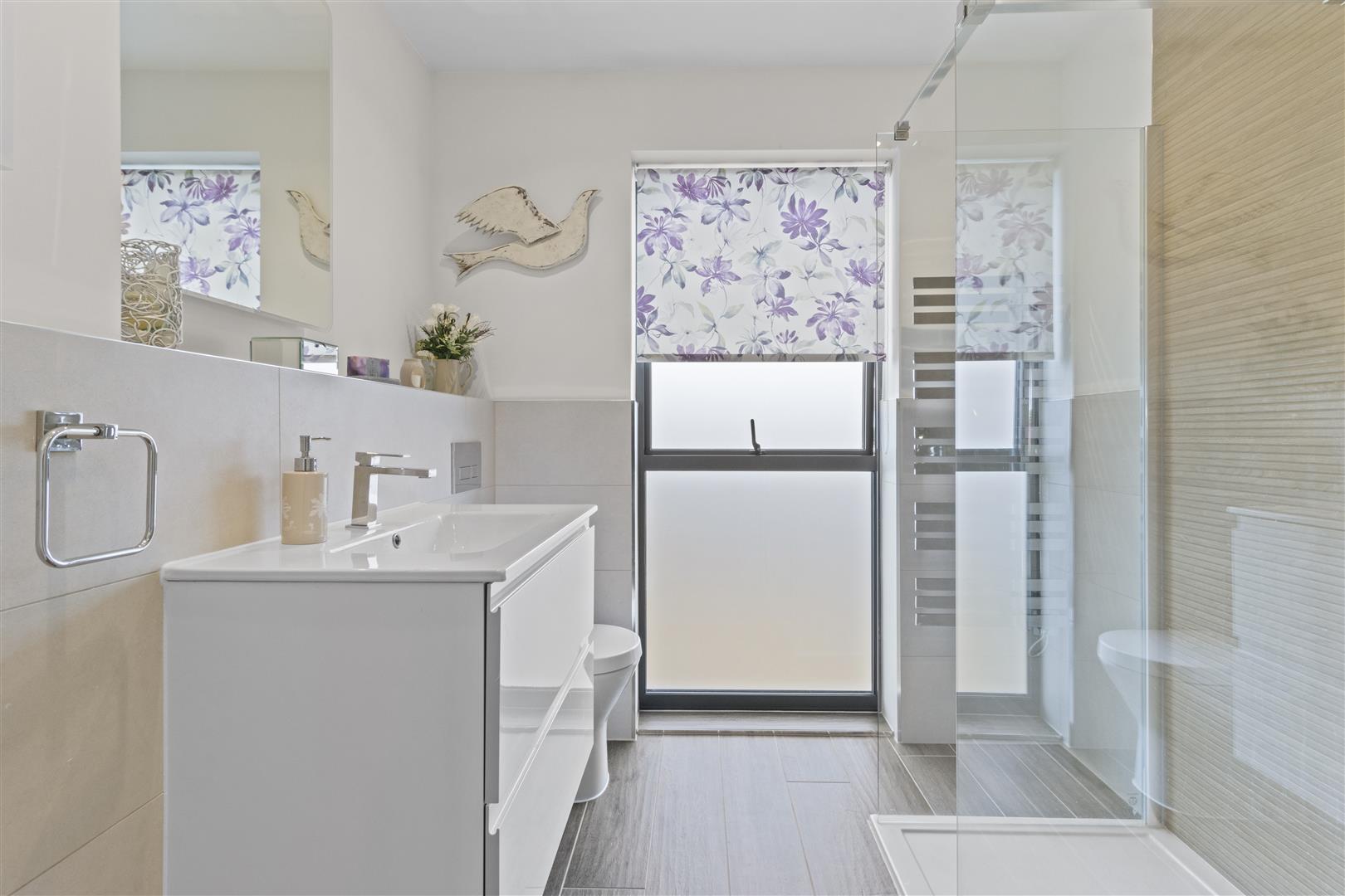 Walk-in shower. Wash basin with storage beneath. Part tiled walls. Extractor fan. Heated towel rail. Obscured window to front.