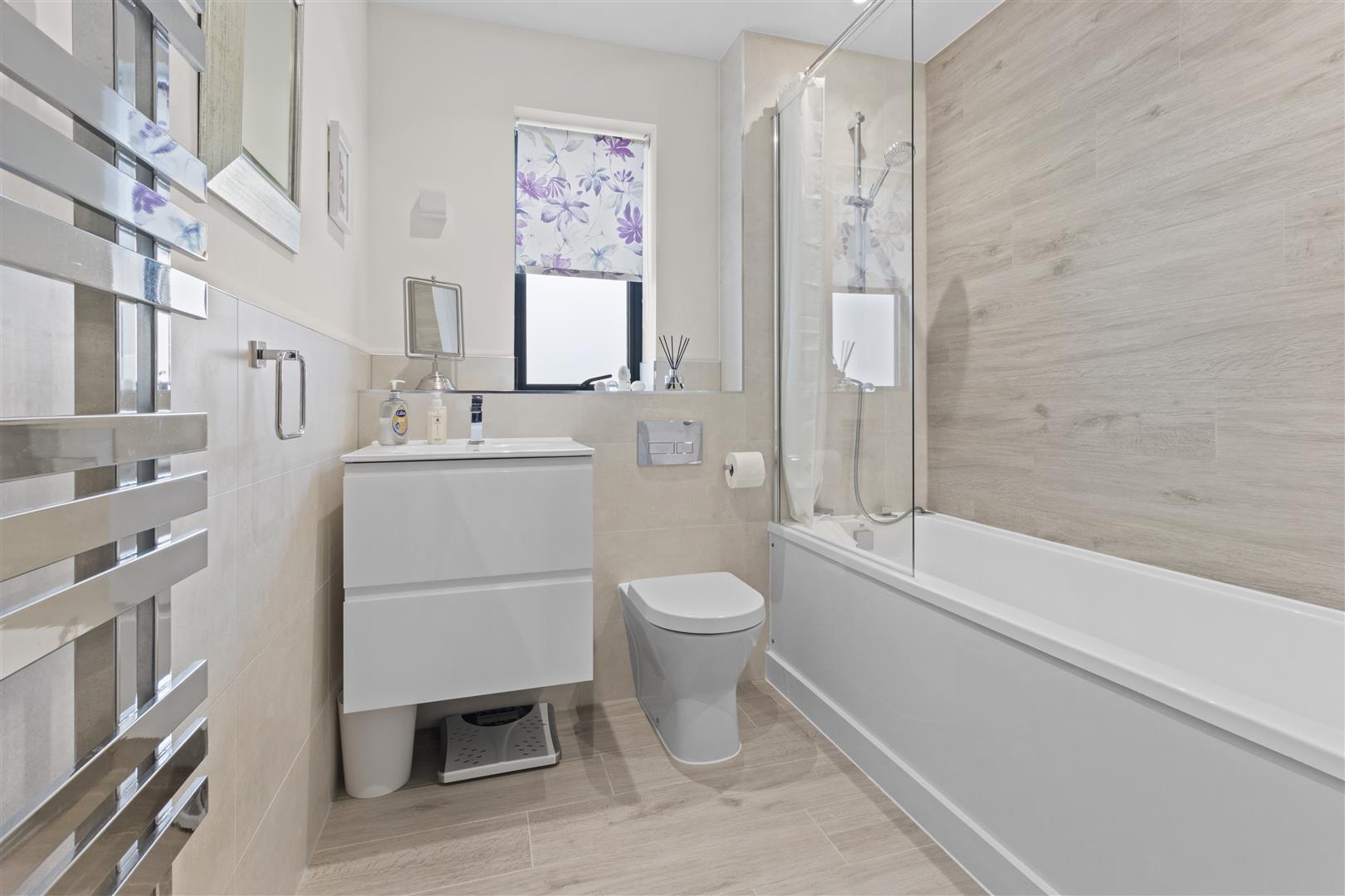Modern suite comprising bath with shower. WC. Sink with undercounter storage. Heated towel rail. Extractor fan. Obscured window.