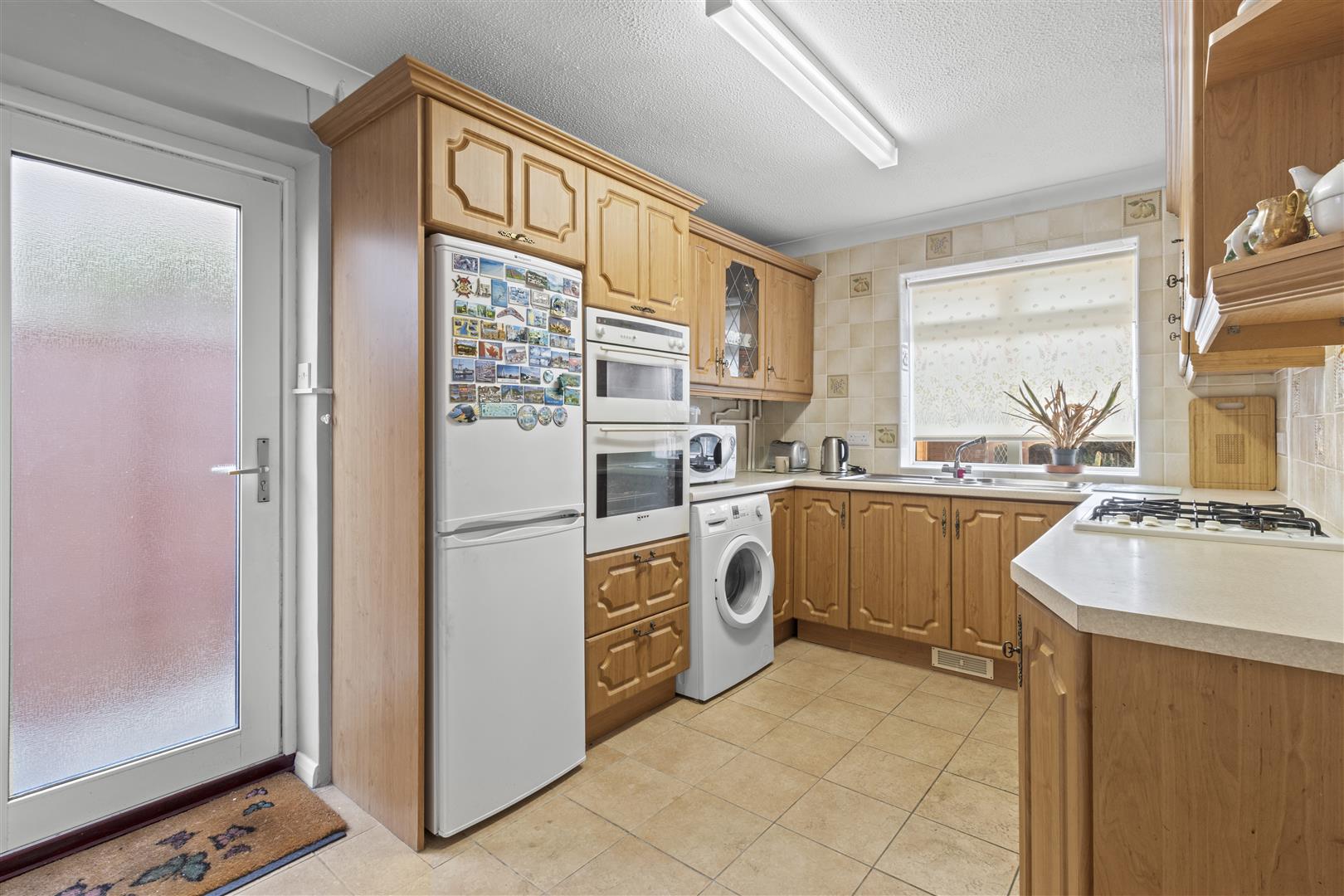 Fitted with a good level of base and wall mounted units. Work surface extending to incorporate sink unit, four ring gas hob and eye-level oven. Space for fridge freezer and washing machine. Door to side way and window overlooking rear garden. Radiator.