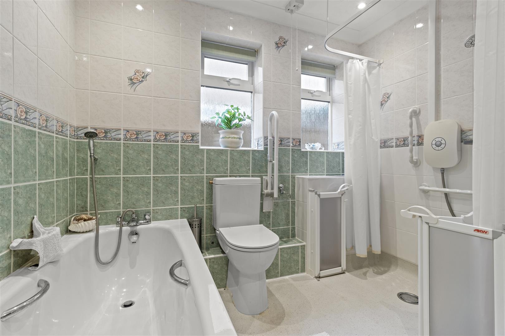 Shower area low suite WC and panelled bath. Pedestal wash basin. Heated towel rail. Tiled walls and two side windows.