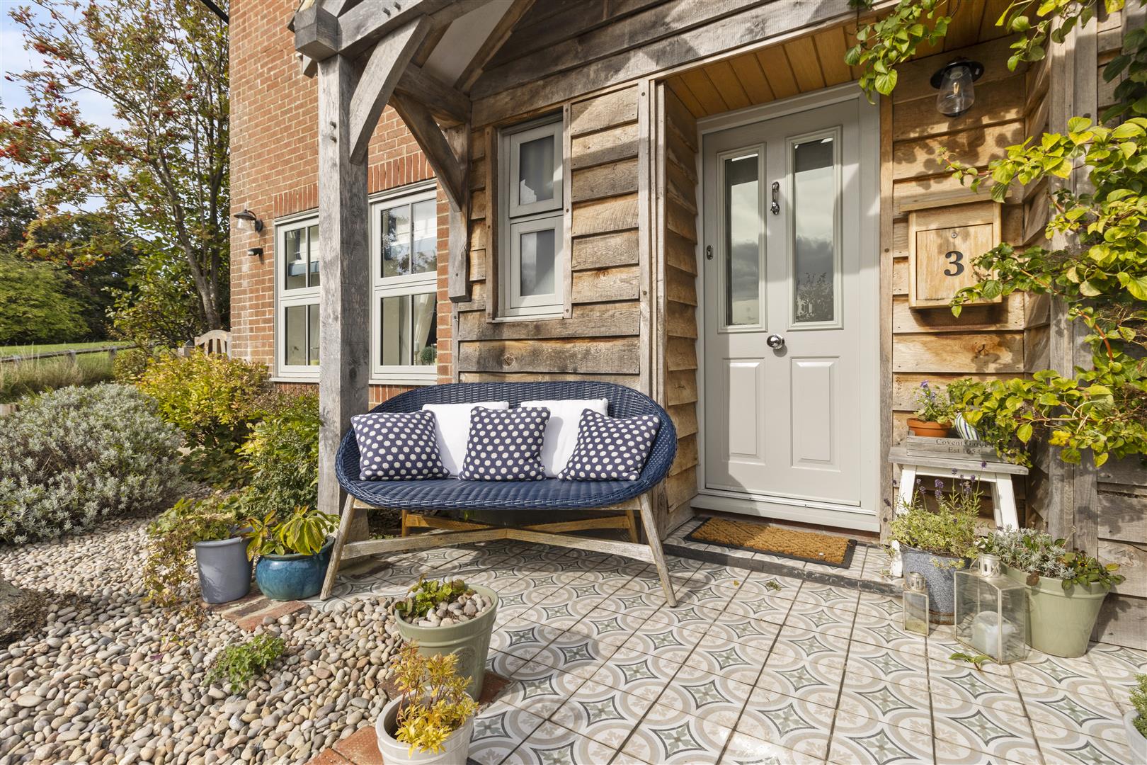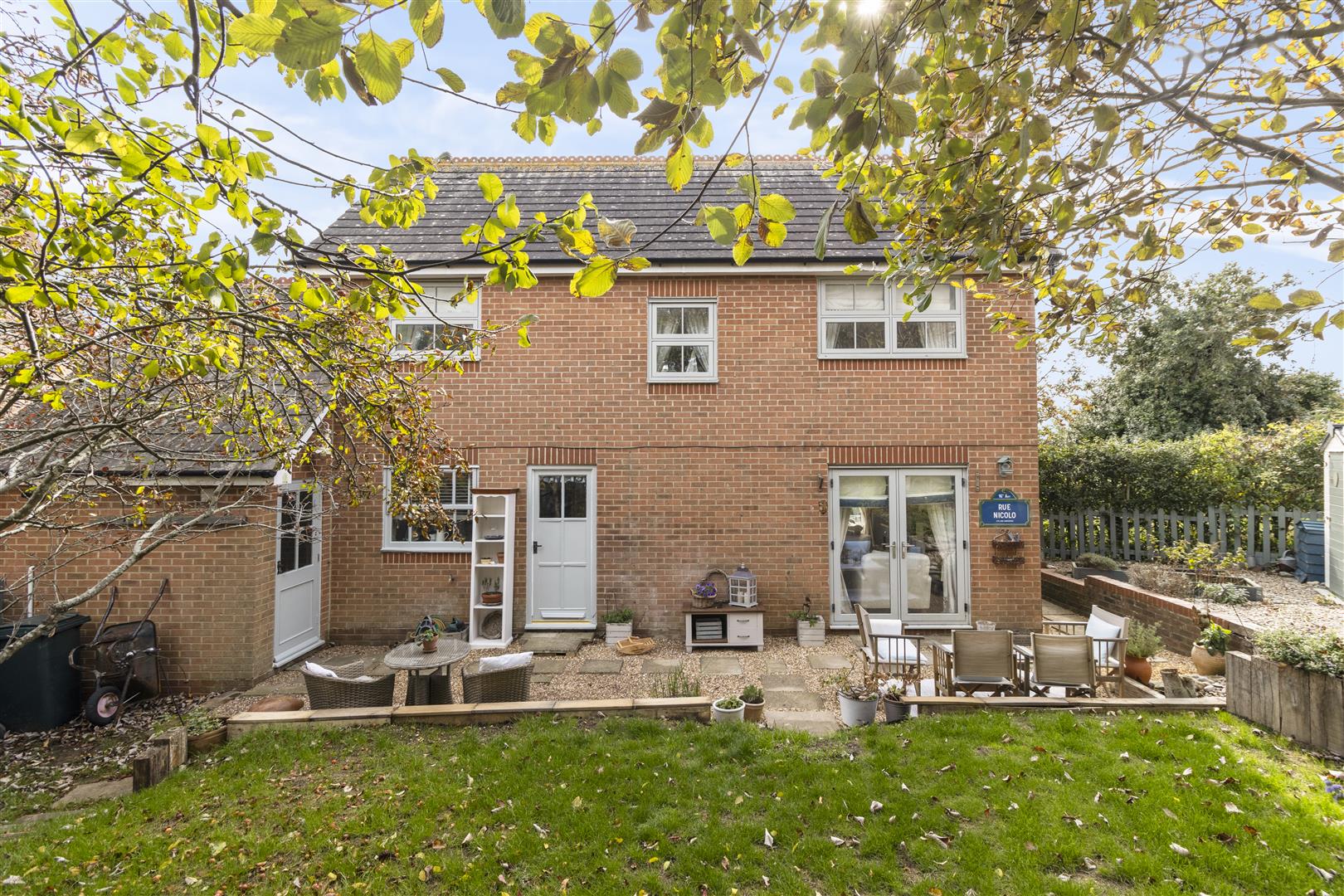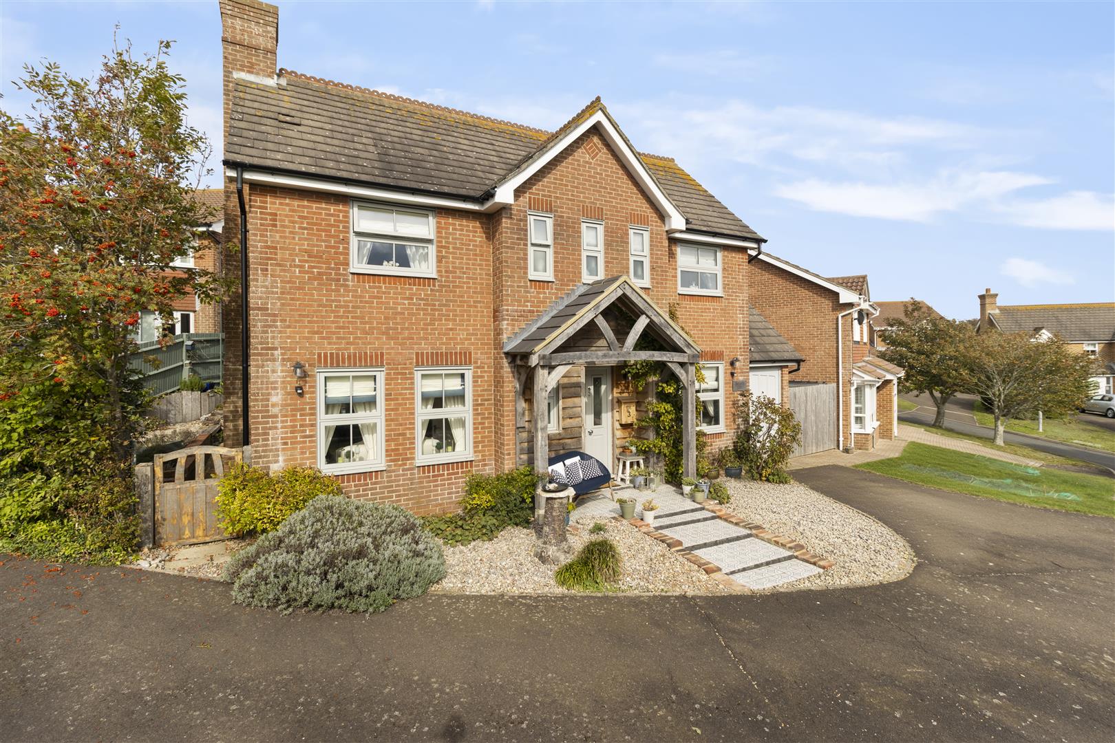 A beautifully presented modern detached home with striking red brick elevations and attractive architectural detailing, set behind a timber porch. The property features a pitched tiled roof with gabled fronts, adding to its characterful charm. With three double bedrooms, this property offers a generous level of accommodation to suit a range of audiences.