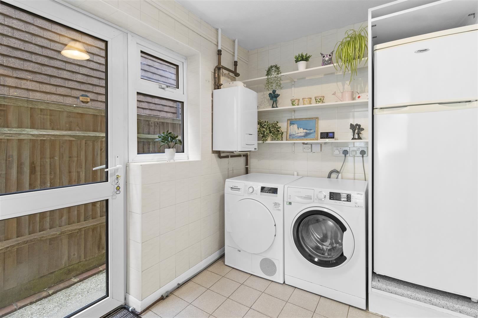 Large storage cupboard. Shelving. Wall-mounted gas boiler. Space for fridge freezer, washing machine and tumble dryer. Door out to side. Window to side.