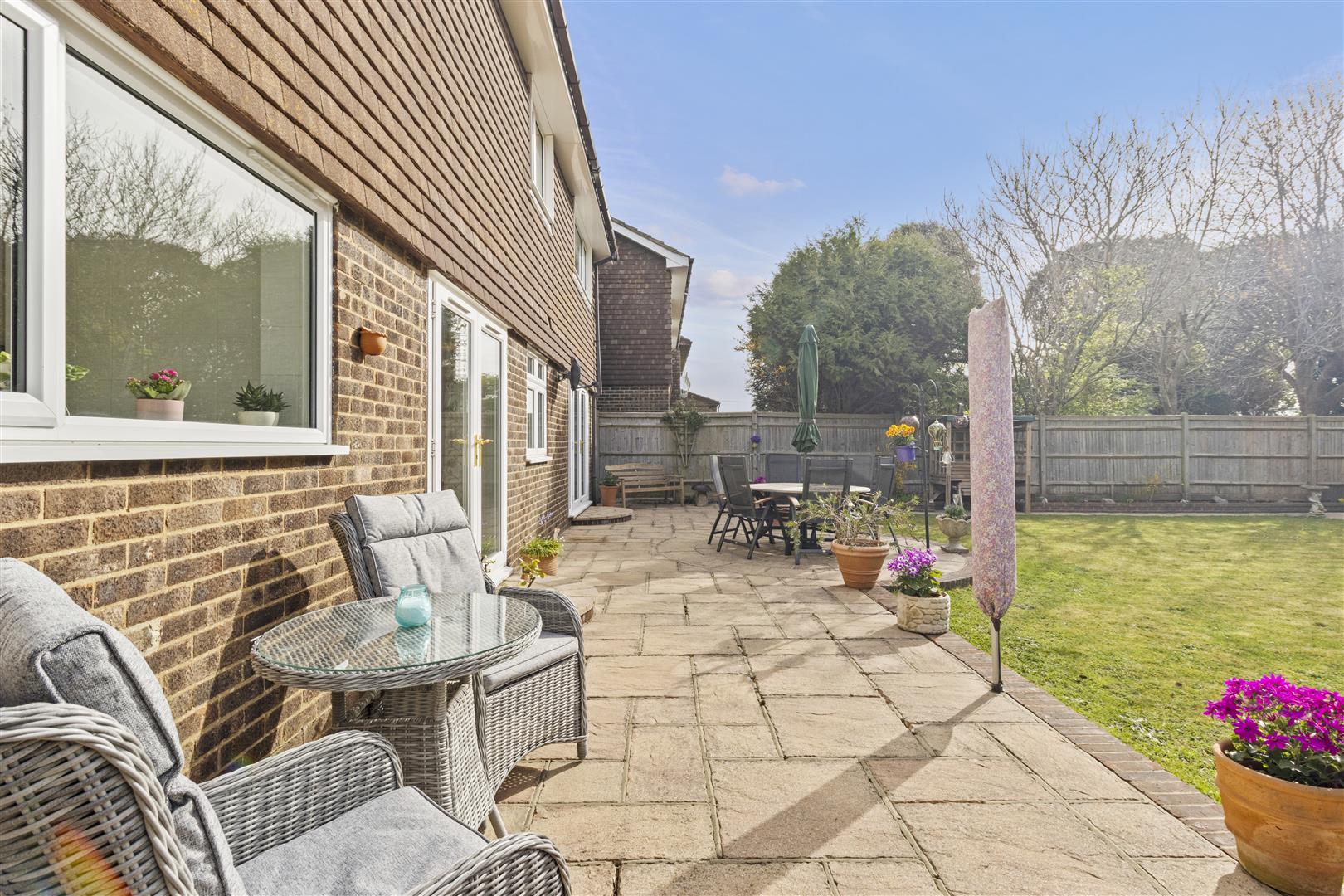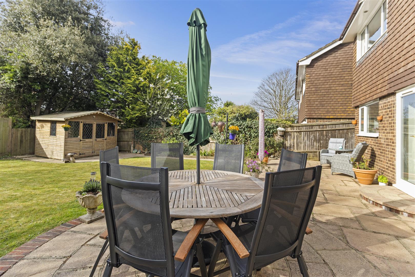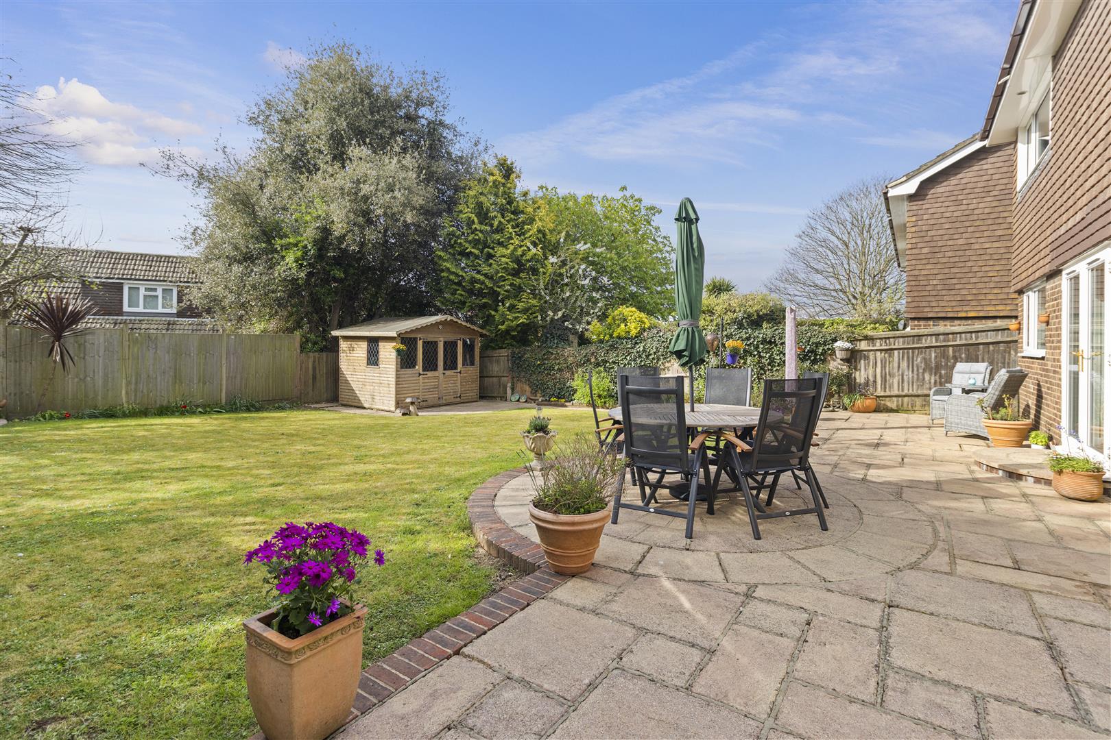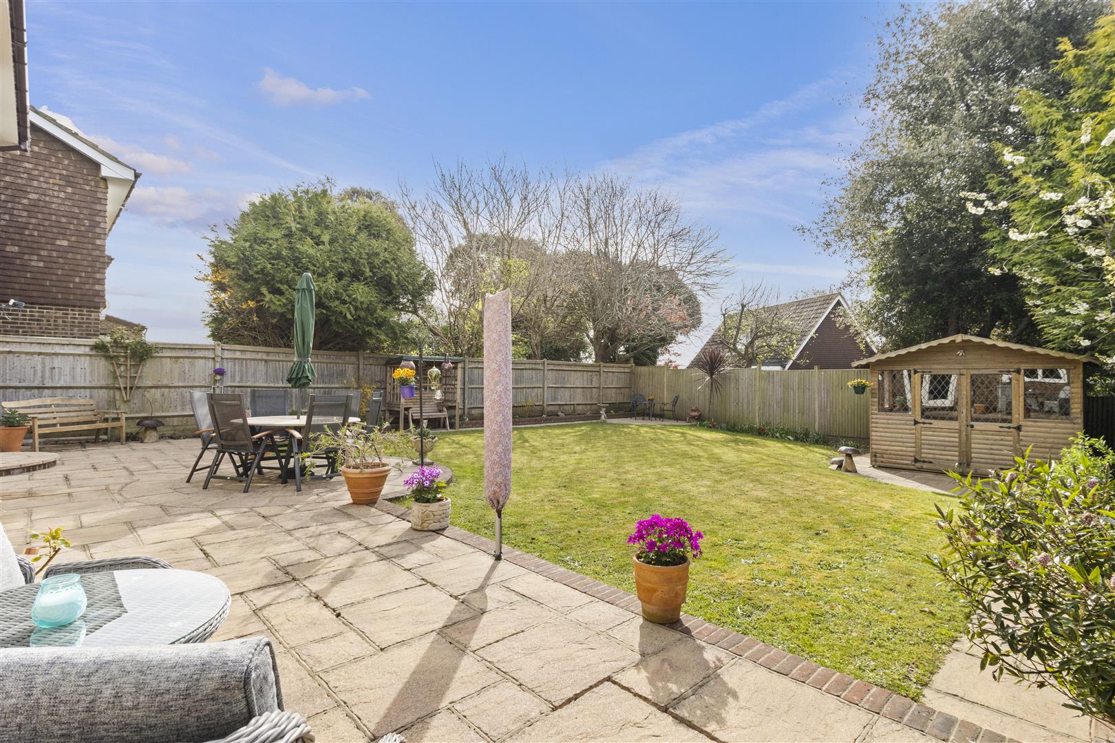 Southerly aspect. Fully fence enclosed. Mainly laid to lawn. Patio. Flower beds. Summerhouse.