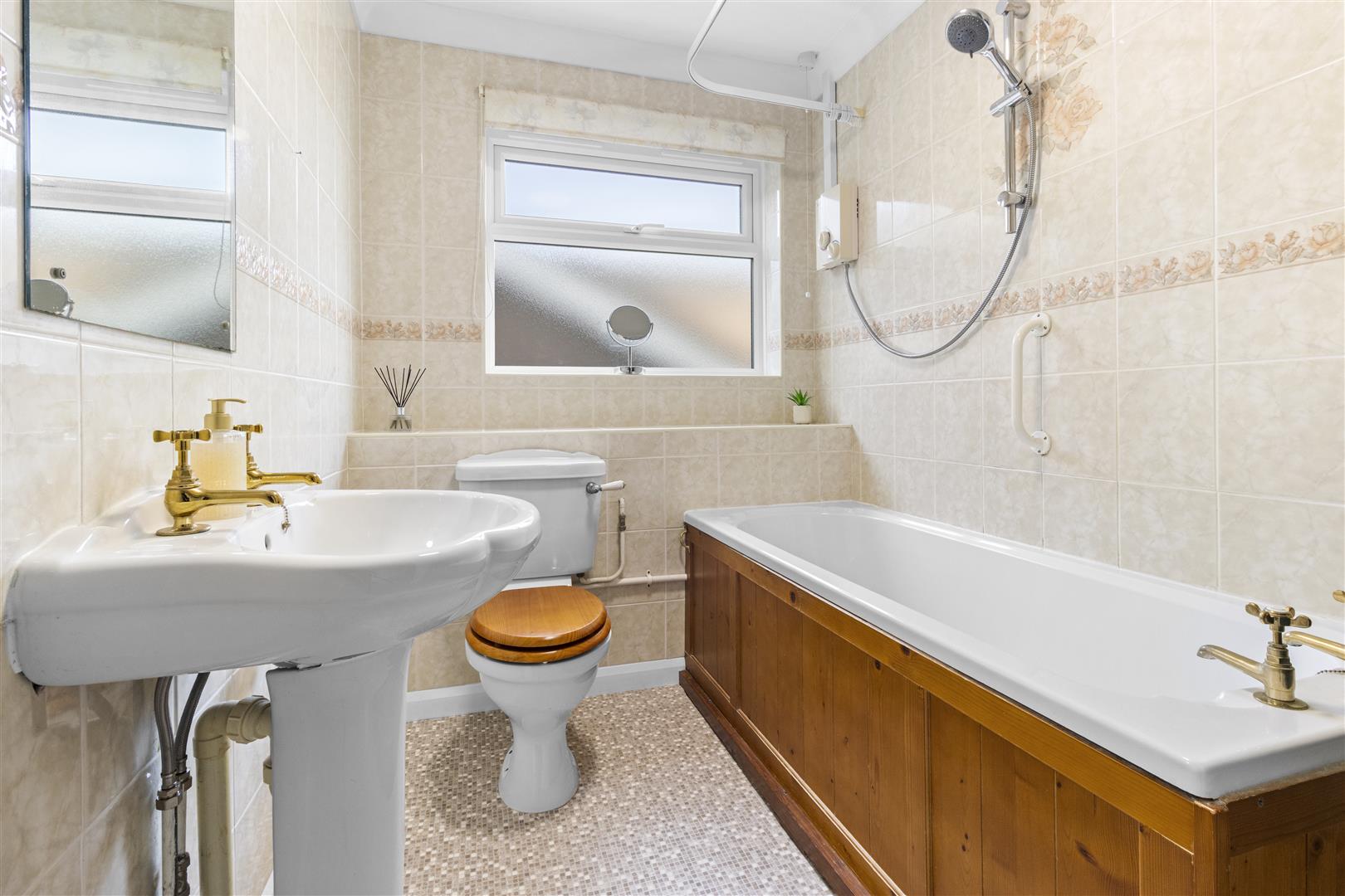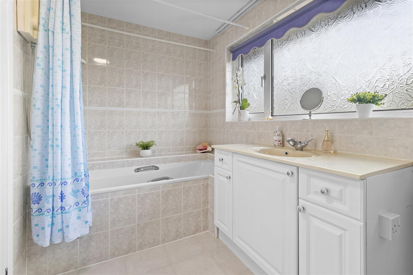 Bath with shower. W.C. Wash basin. Obscured window. Fully tiled walls. Heated towel rail. Vanity unit.