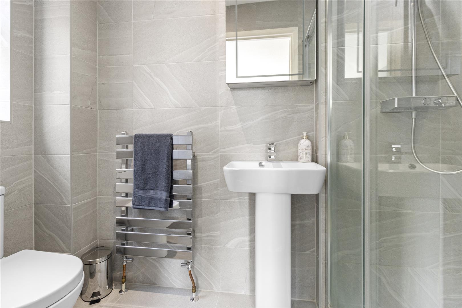 Modern enclosed shower. W.C. Wash basin. Heated towel rail. Obscured window to side. Extractor fan. Fully tiled walls.
