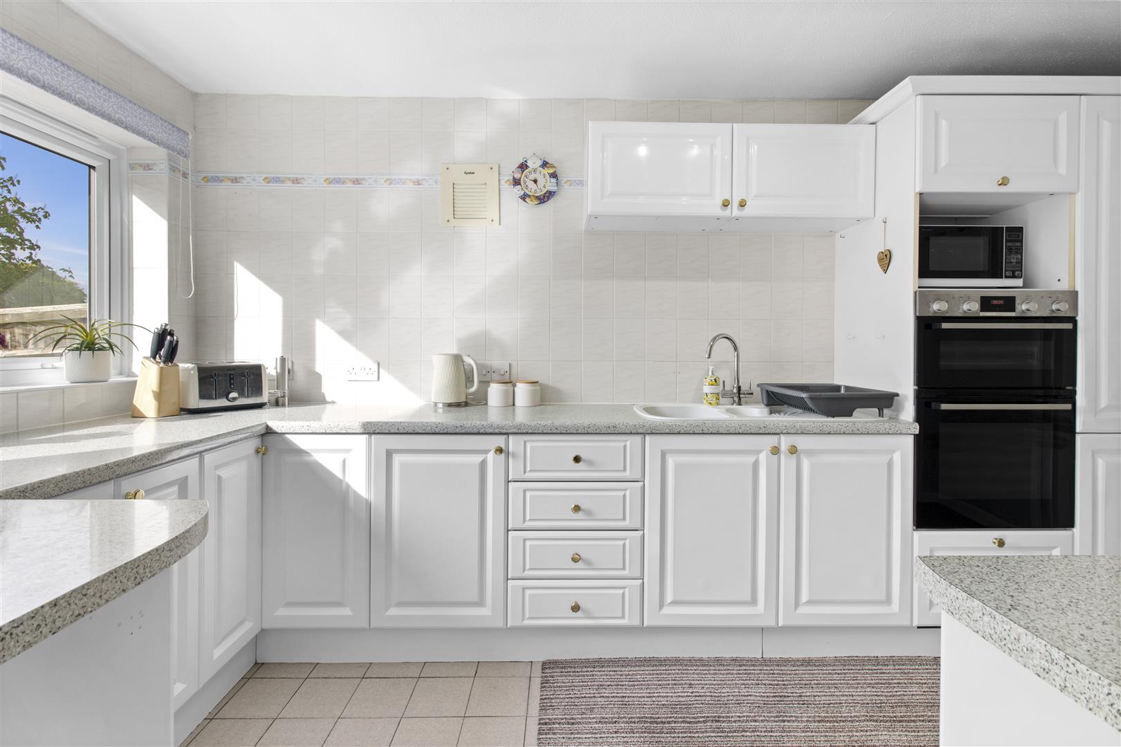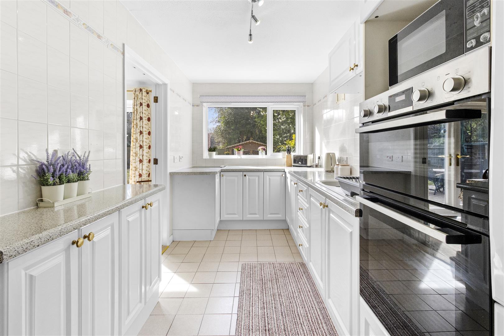 Range of white base and wall storage units. Ample worktop space. One and half sink and drainer. Eye-level Bosch cooker and oven. Induction hob. Window to rear overlooking the garden. Tiled walls. Door into:
