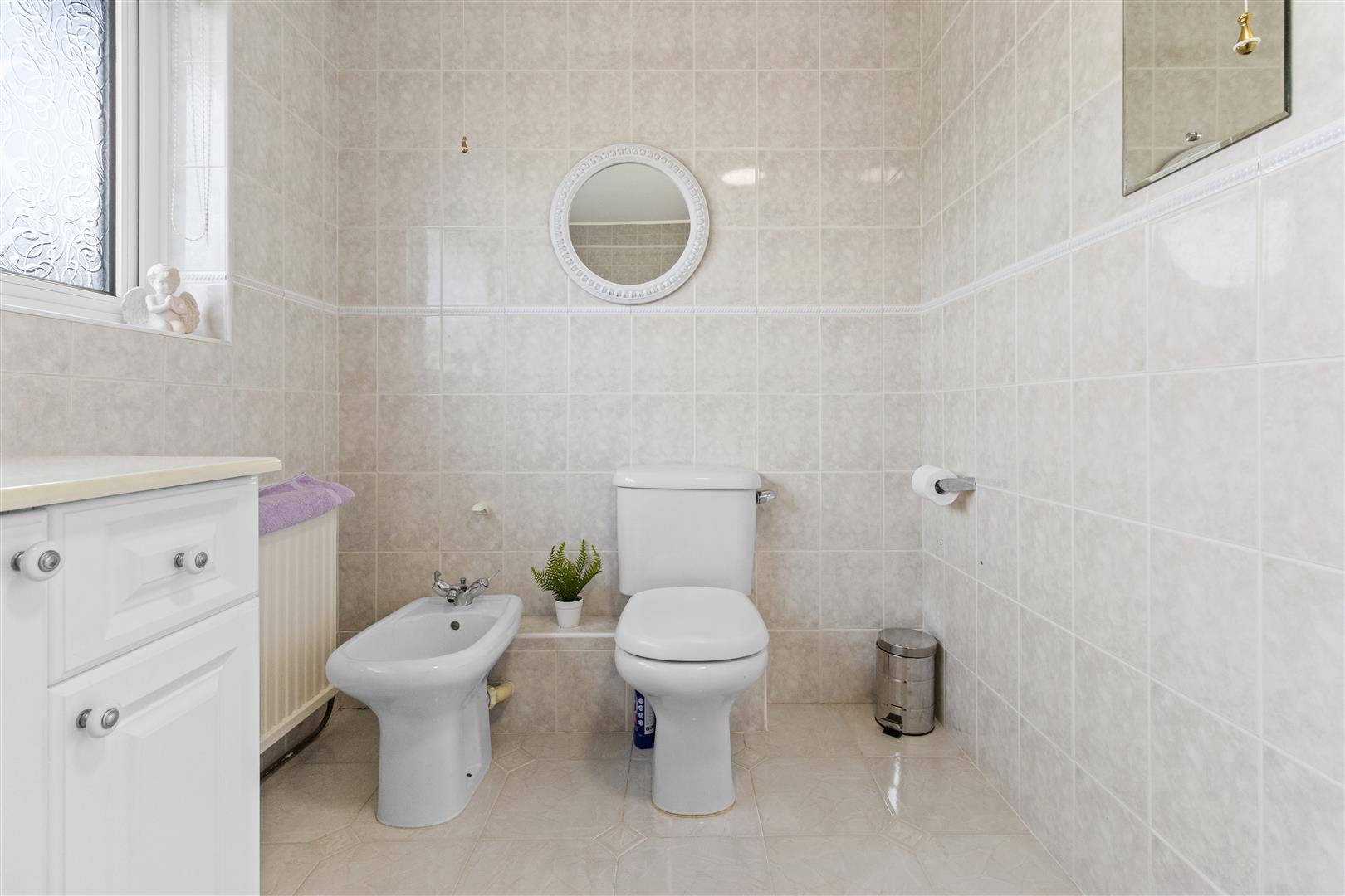 Bath with shower. W.C. Wash basin with ample storage cupboards beneath. Bidet. Radiator. Obscured window to front. Extractor fan. Fully tiled walls.