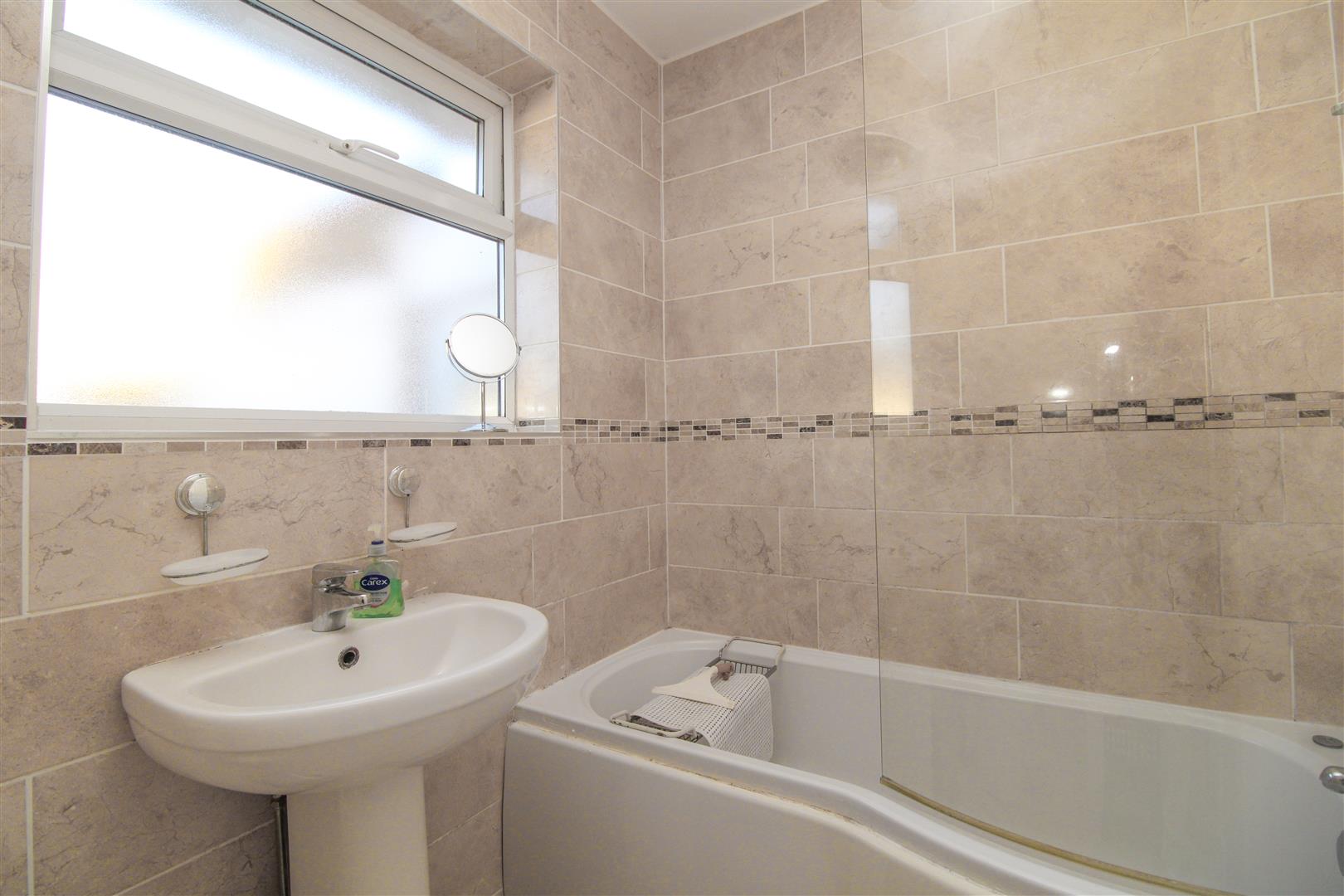 White suite comprising bath with shower unit and glass screen. Wash basin and close coupled WC. Double glazed window to side. Towel rail. Tiled wall and floor.