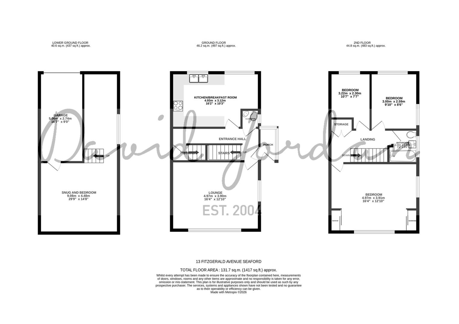 The property features include three bedrooms, bathroom, cloakroom, kitchen/breakfast room, sitting room and lower ground floor arranged as a bedroom with snug.