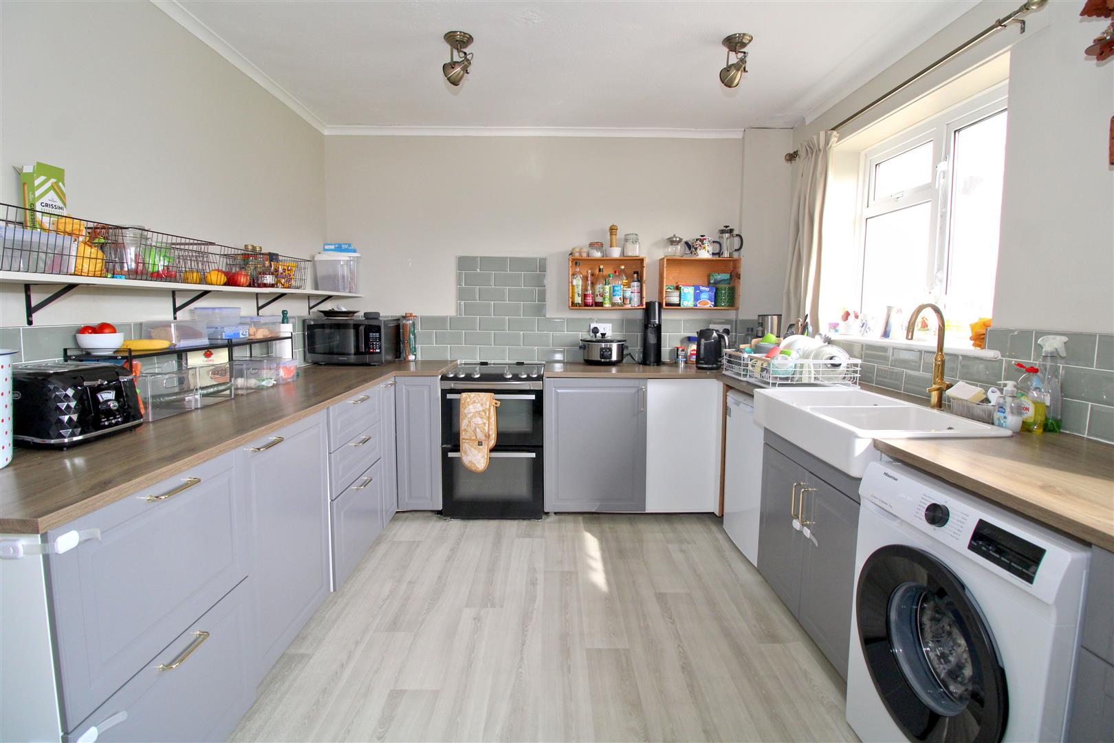 Base units with work surface over with double sink and tiled splash back. Space for cooker, washing machine and freezer. Two double glazed windows. Radiator. Space for breakfast table.