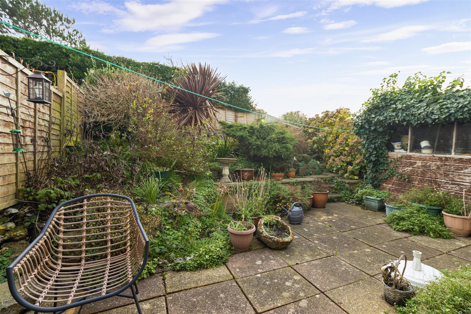 Mainly laid to patio with steps up to planted area with shrubs and flowers. Fence enclosed. Timber shed.