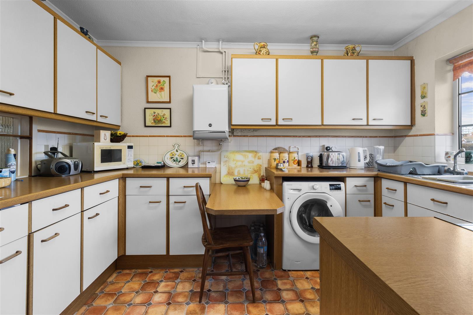 Range of fitted units. Space for cooker. Work surface with sink and drainer. Part tiled walls. Baxi wall mounted boiler. Double glazed window and small single glazed window to front.