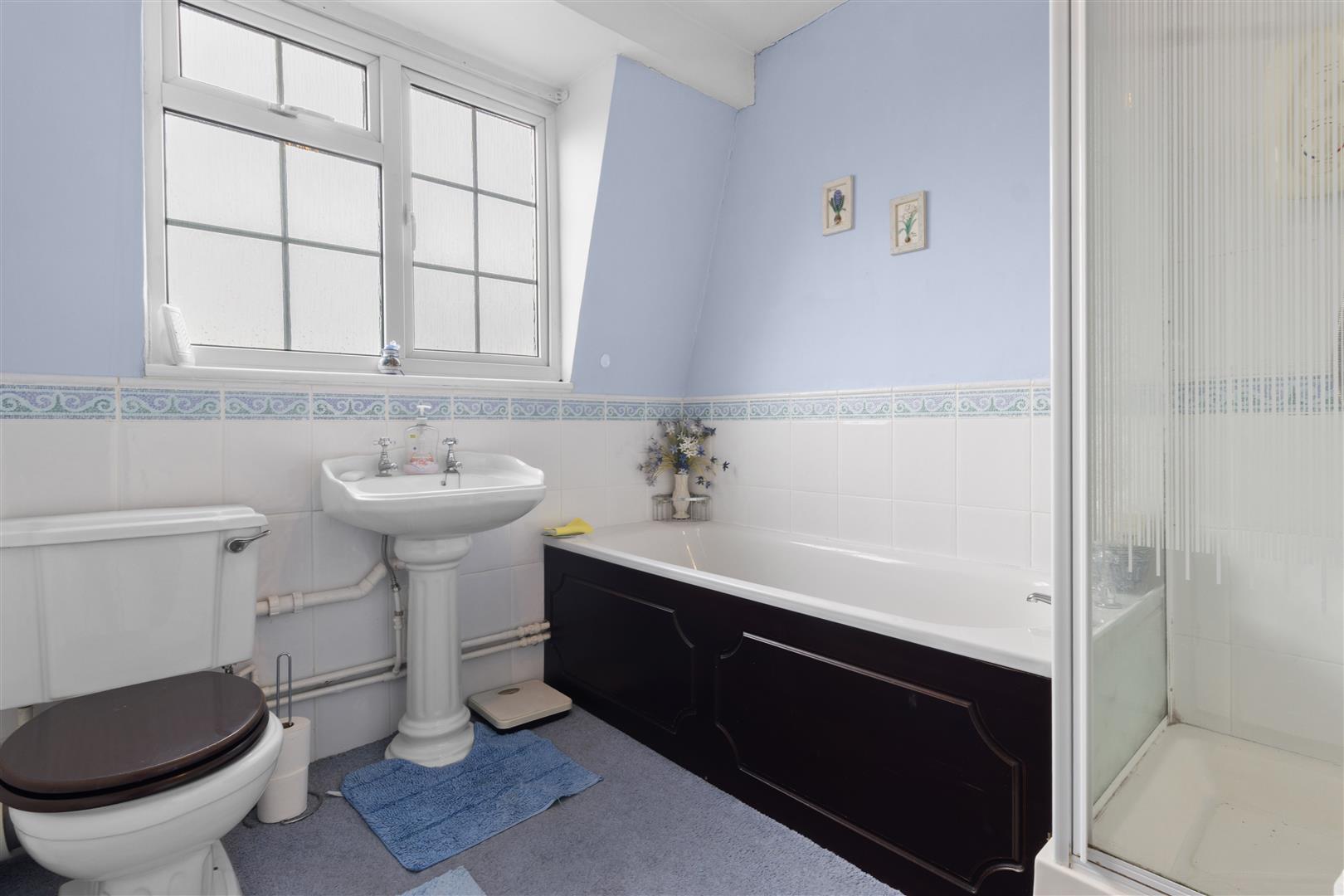 Comprising bath, shower enclosure, close coupled WC, and pedestal wash basin. Double glazed obscured window to front. Part tiled walls. Radiator.