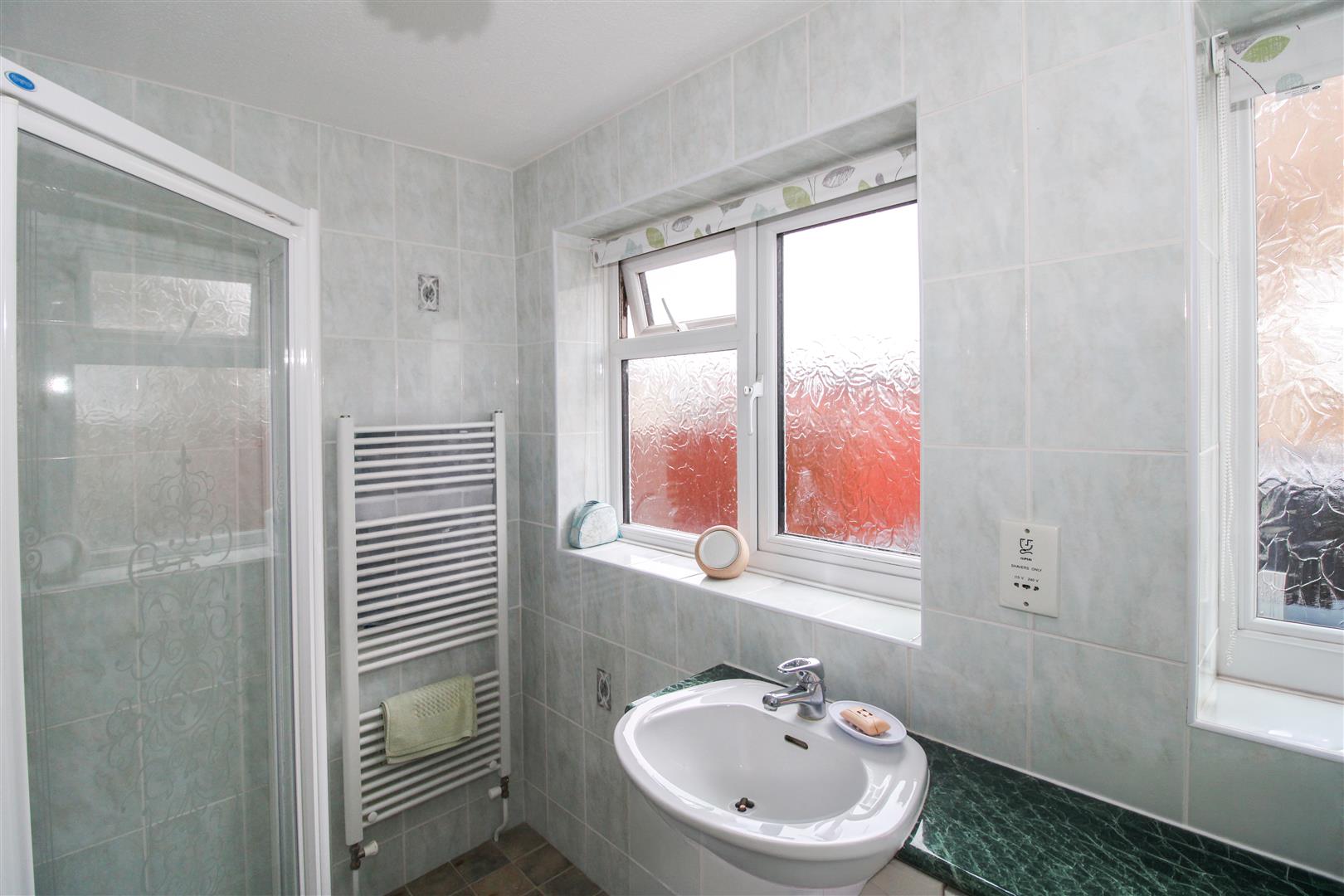 Corner shower enclosure. Wash basin with storage beneath. WC. Heated towel rail. Shaving point. Fully tiled walls. Two obscured windows.