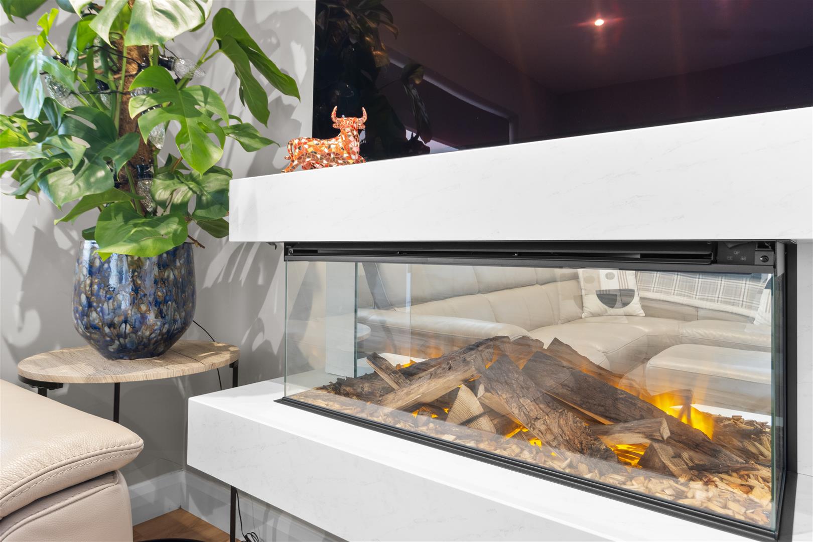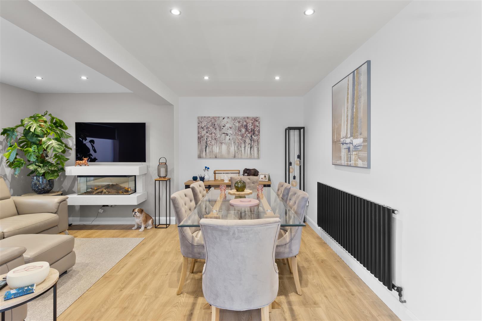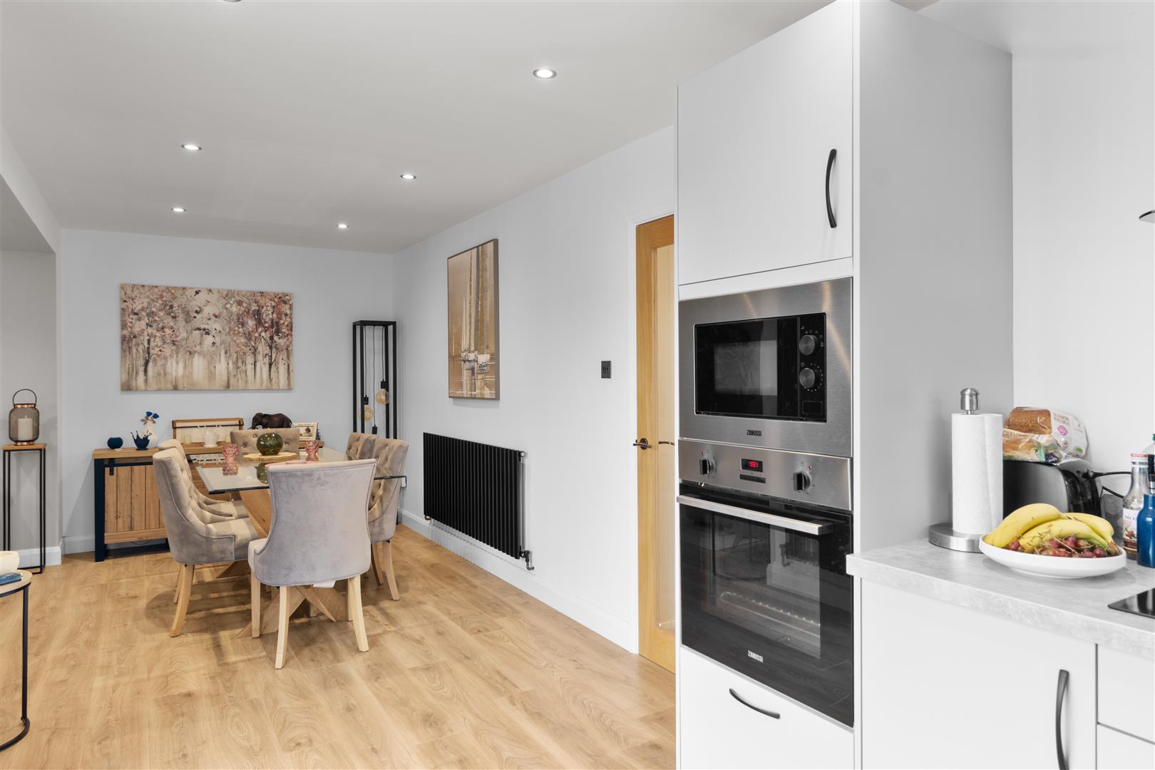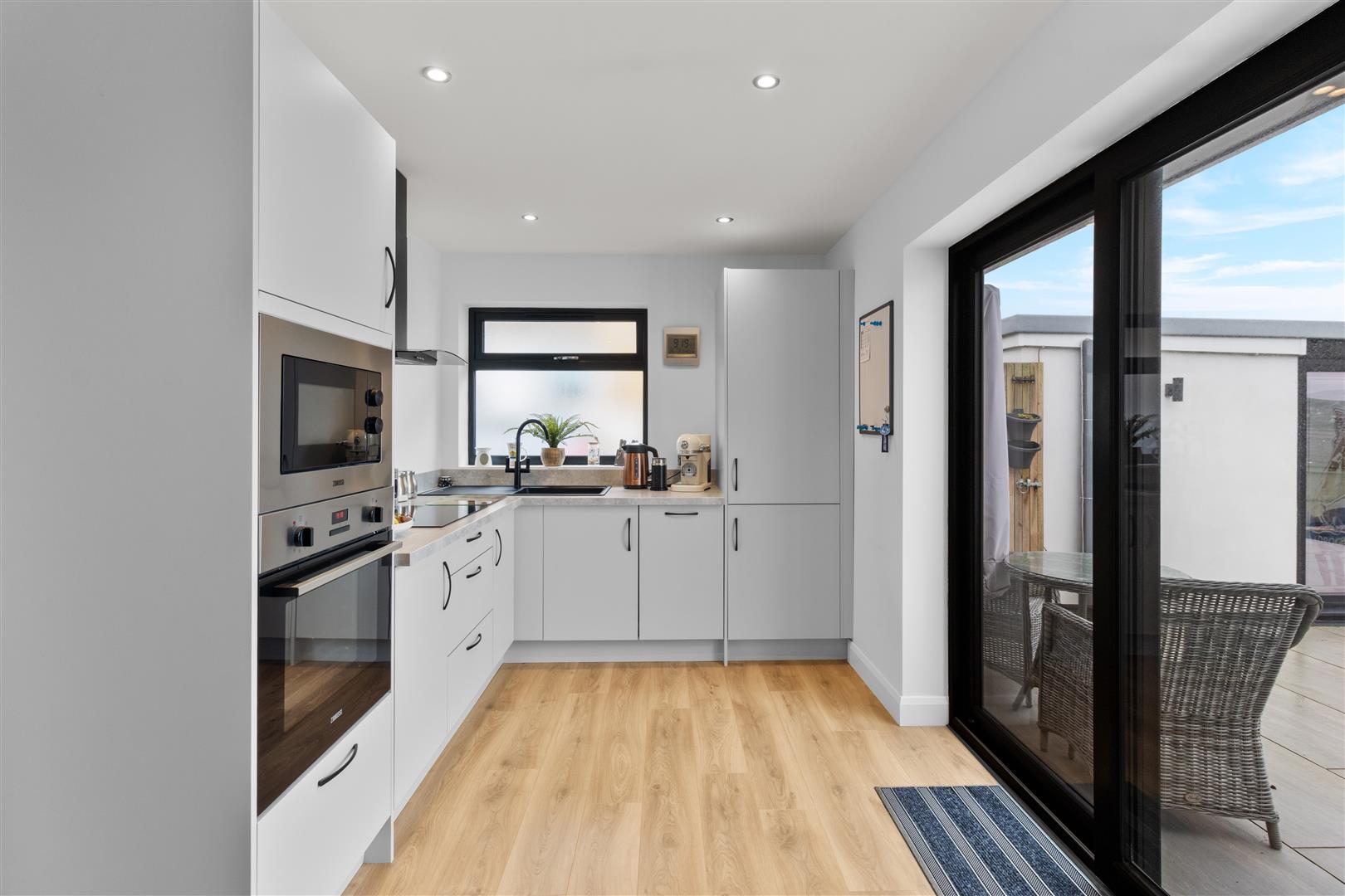 A light and and bright space with double glazed windows and sliding patio doors overlooking and leading out onto the rear garden. The kitchen area is fitted with a modern range of base units with worksurface over incorporating single drainer sink unit with mixer tap, induction hob with splashback and cooker hood over, integrated oven and microwave, fridge/freezer and slimline dishwasher. The living area features a wall mounted log effect fireplace, there are also two contemporary wall mounted radiators within this open plan area.