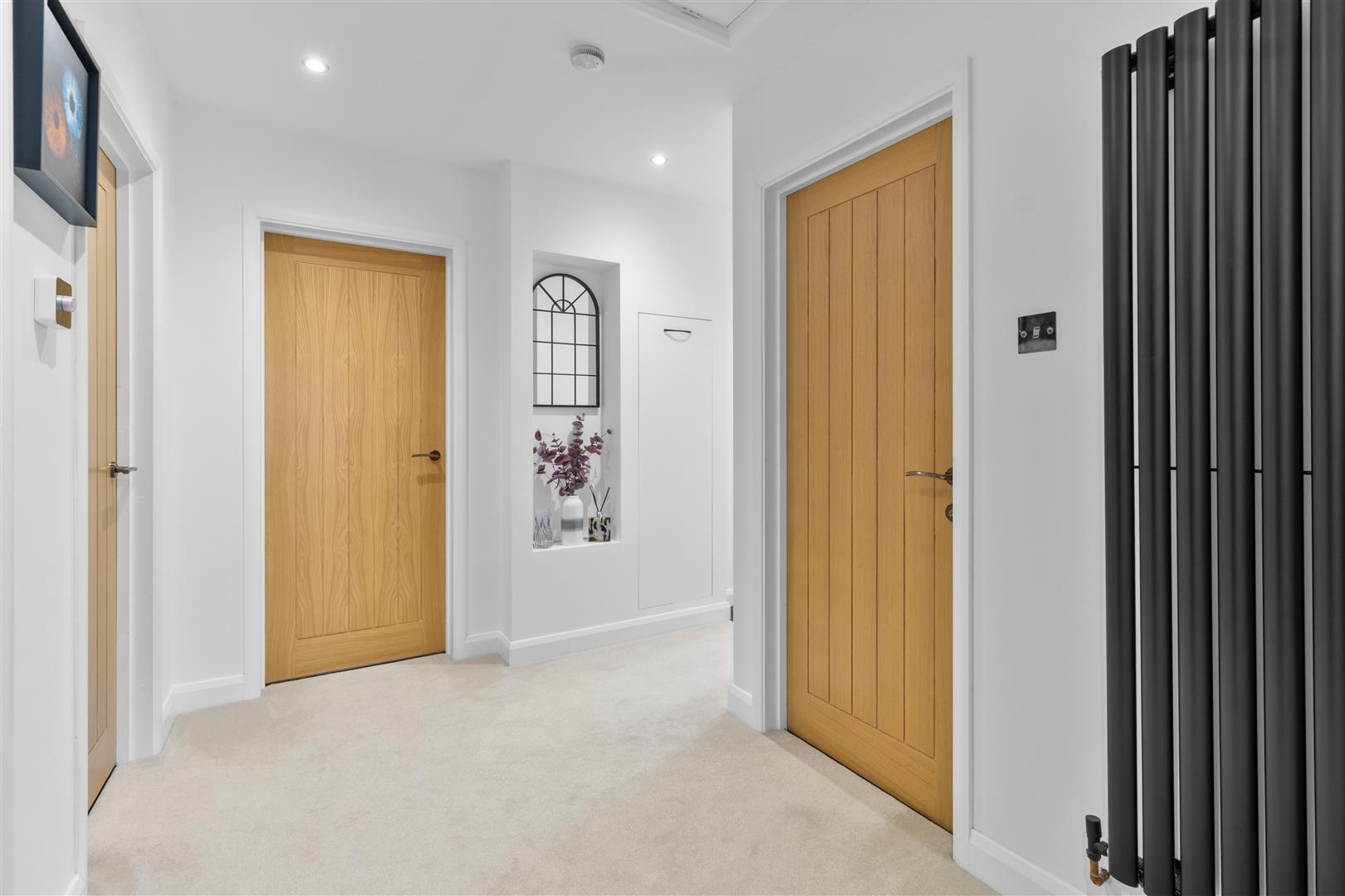 Contemporary wall mounted radiator. Smooth plastered ceiling within inset spotlighting. Hatch to partially boarded loft space housing boiler, accessible by loft ladder. Cupboard with space and plumbing for washing machine and shelving above. Central heating thermostat. Slimline cupboard housing gas meter and consumer box.