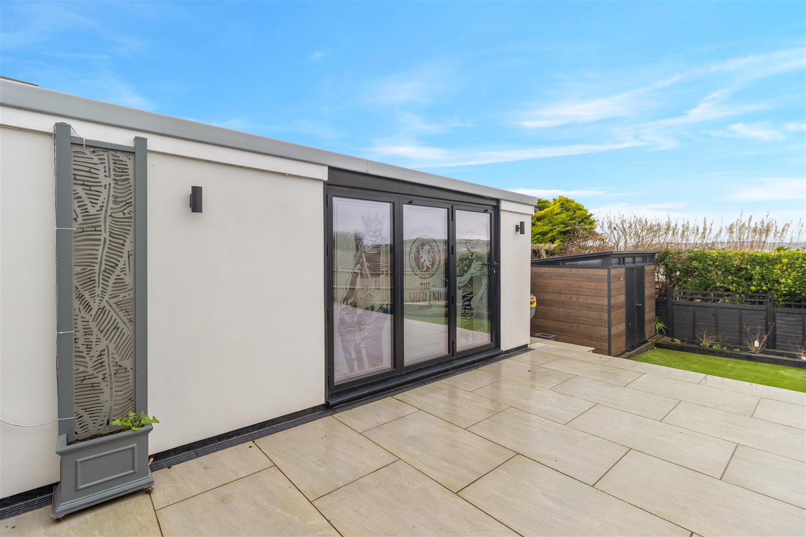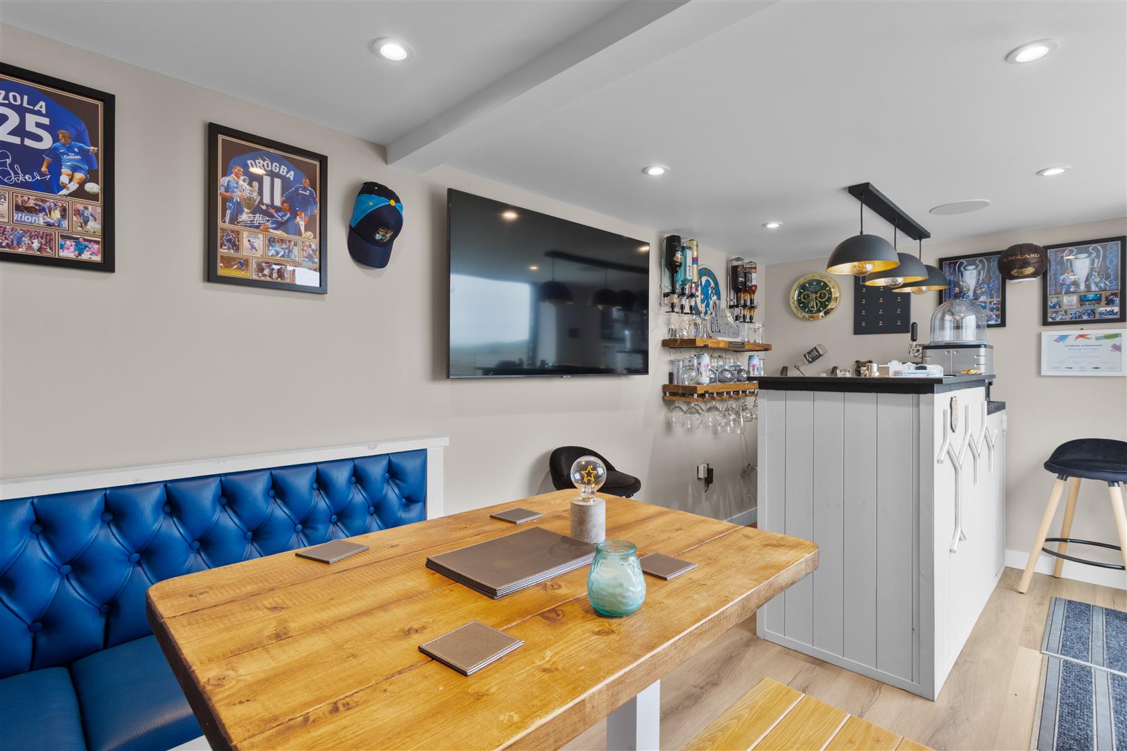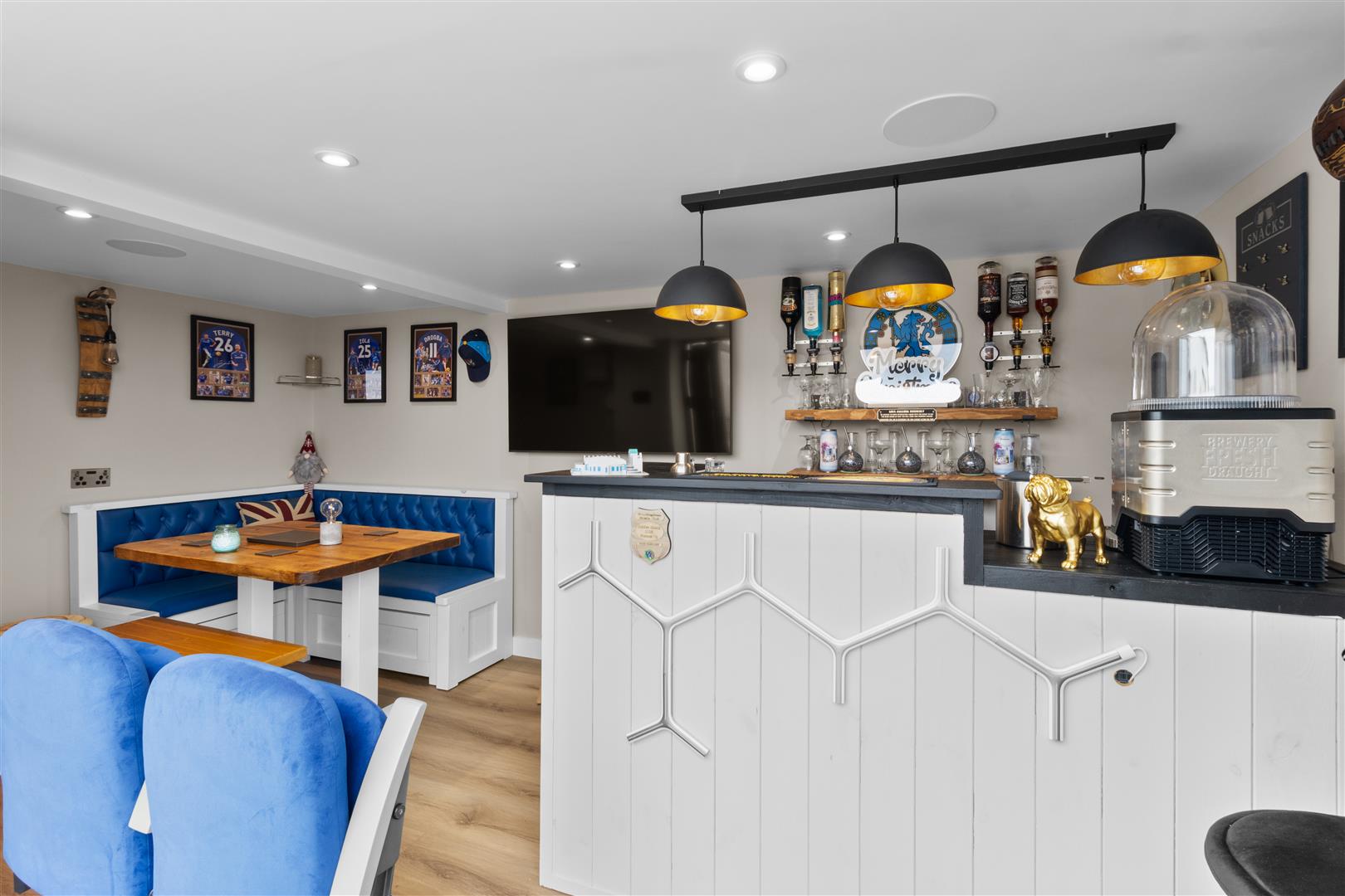 Bi-fold doors, radiator, television aerial point, smooth plastered ceiling within inset spotlighting and speakers, bar area with fridge, shelving and optics. Corner bench with table.