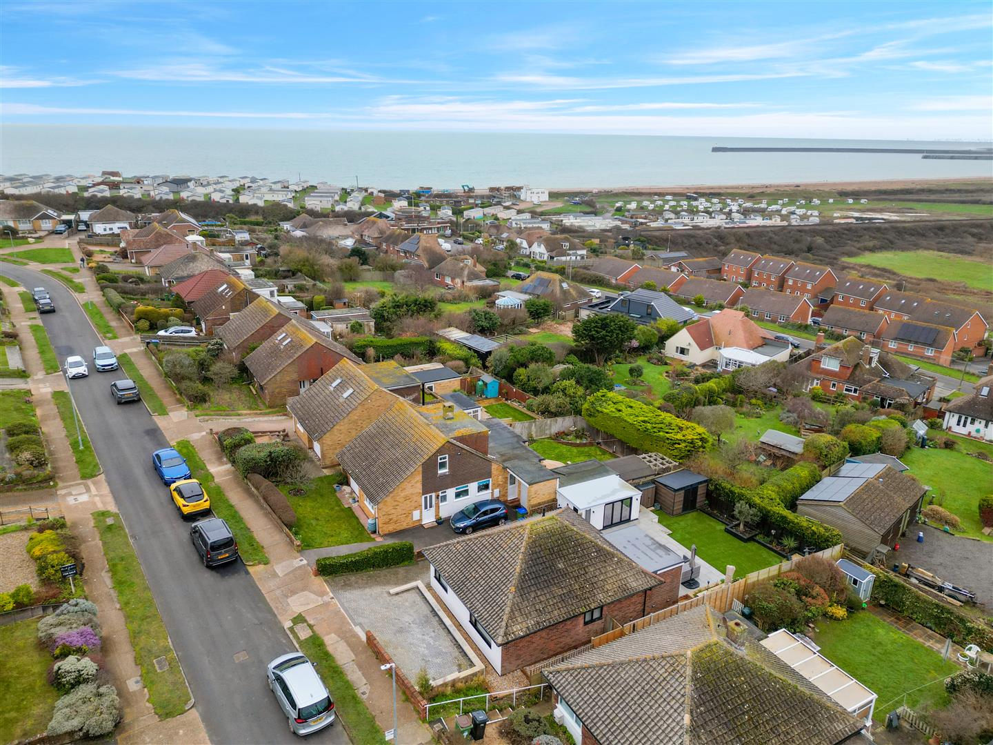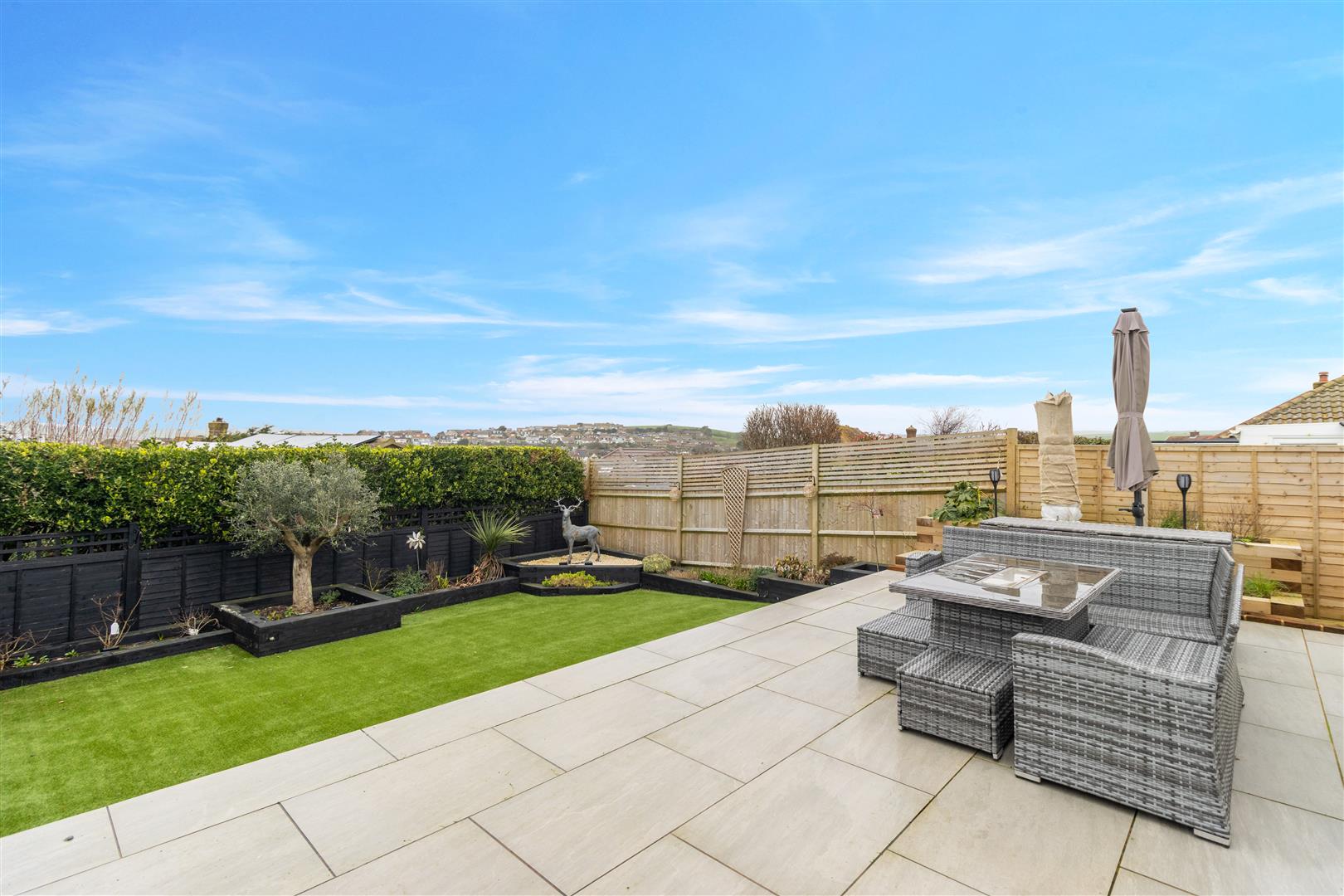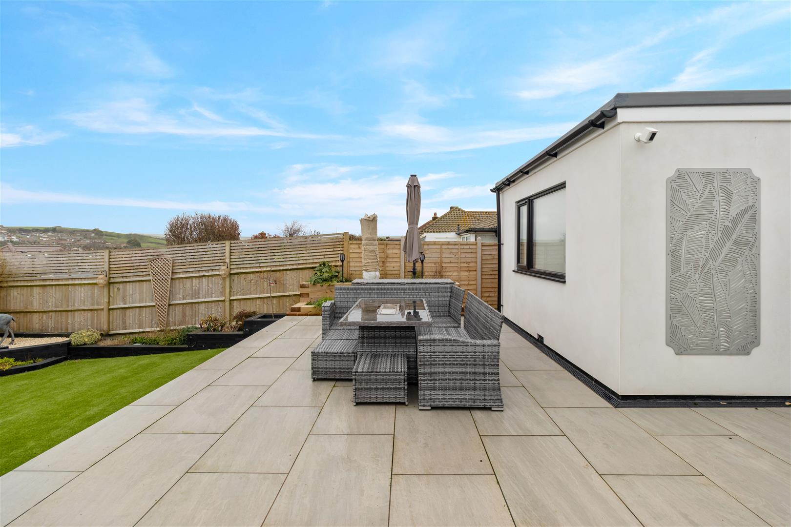 Stunning tiled patio terrace enjoying views over farmland to Bishopstone Village and beyond and then across Tide Mills to Newhaven Harbour. Steps leading down to area of artificial lawn with raised treated timber beds. Two composite sheds. Outside tap. Small pebbled area of side garden.
