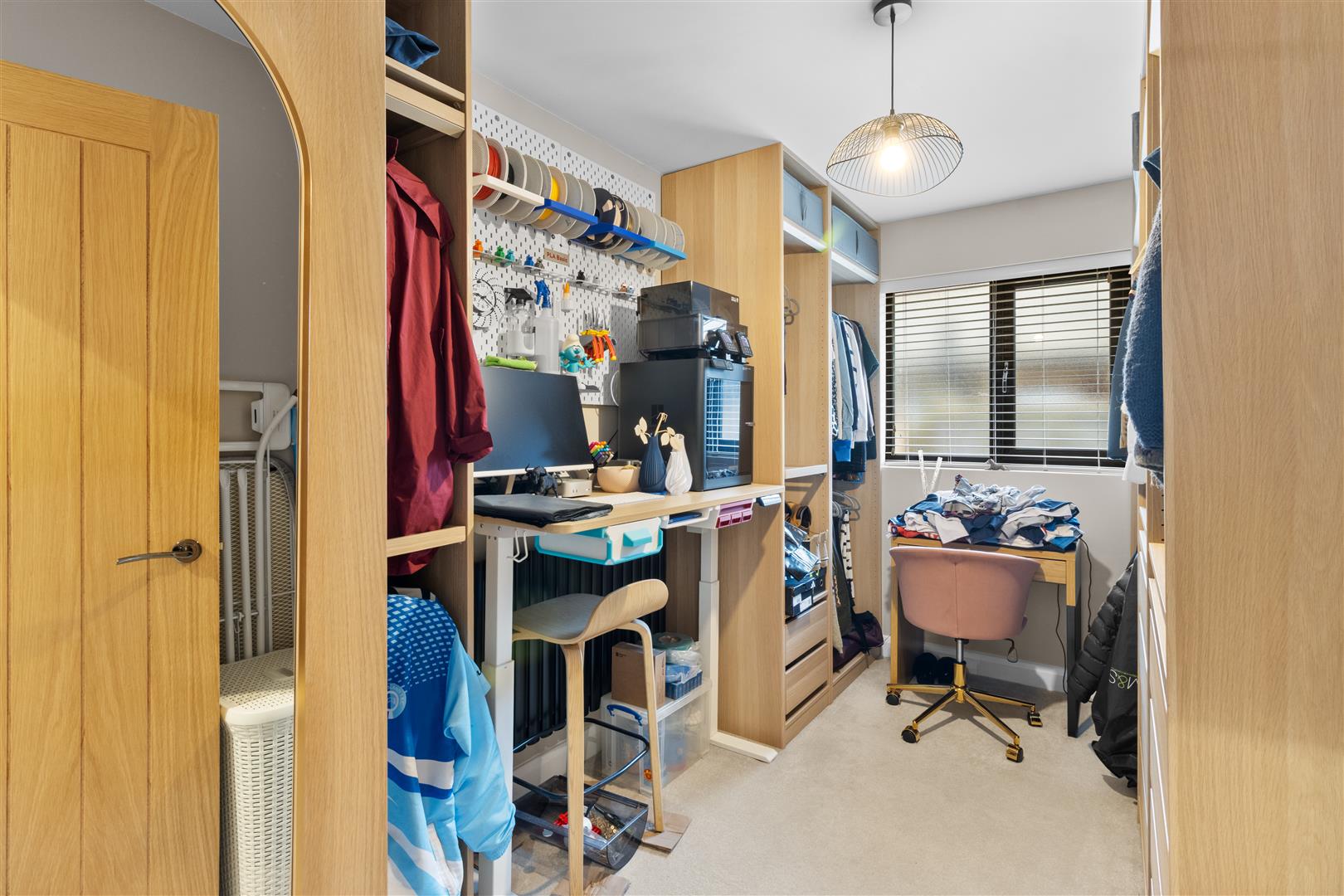 Currently designed to be used as a hobby/dressing room with range of tastefully fitted wardrobes, drawers and accessory storage. Double glazed window. Smooth plastered ceiling. Radiator.