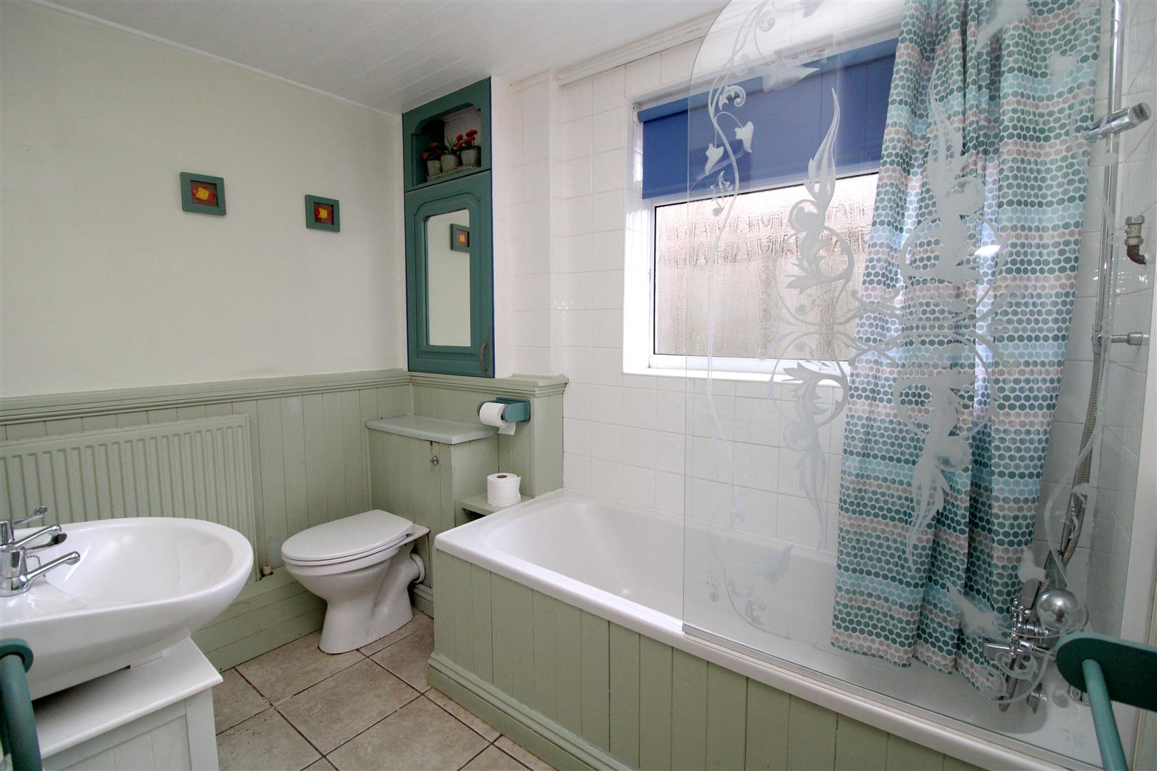 White suite comprising of a bath with shower above. Close coupled WC. Wash basin. Part tiled walls. Obscure window to side. Extractor fan.