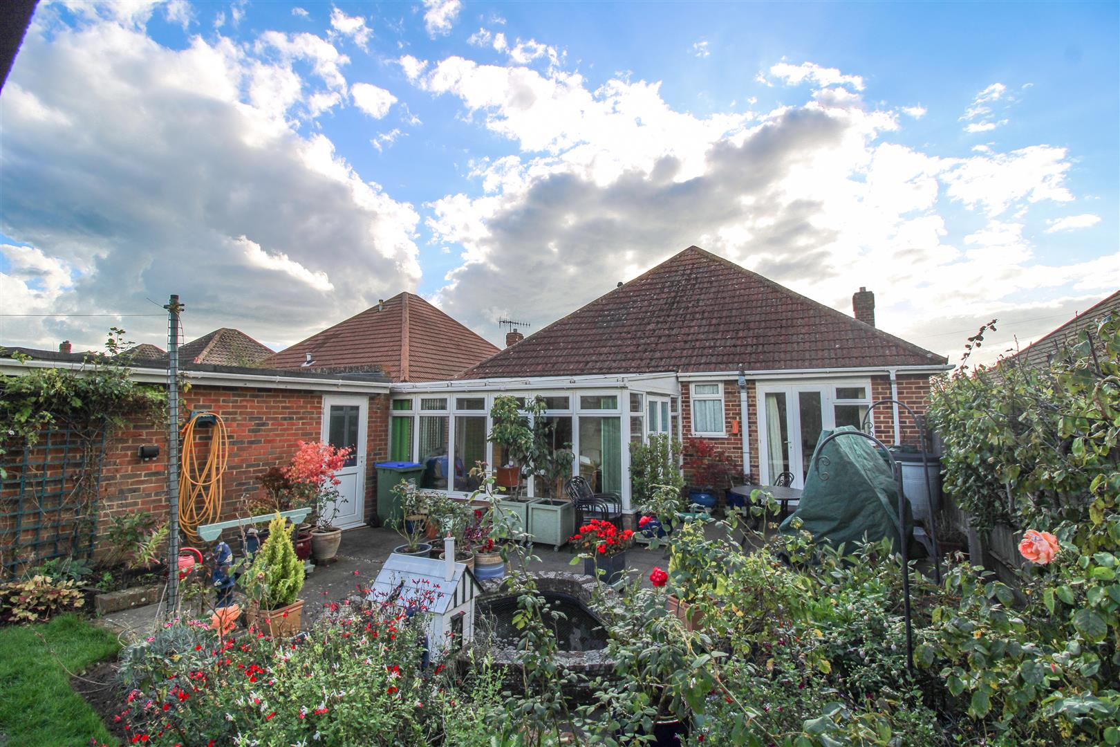 The delightful rear garden is laid out in three sections: a paved patio with pond, a lawned area with paved seating space, and a vegetable garden at the far end with raised beds, greenhouse and timber shed. There are also plum and apple trees.