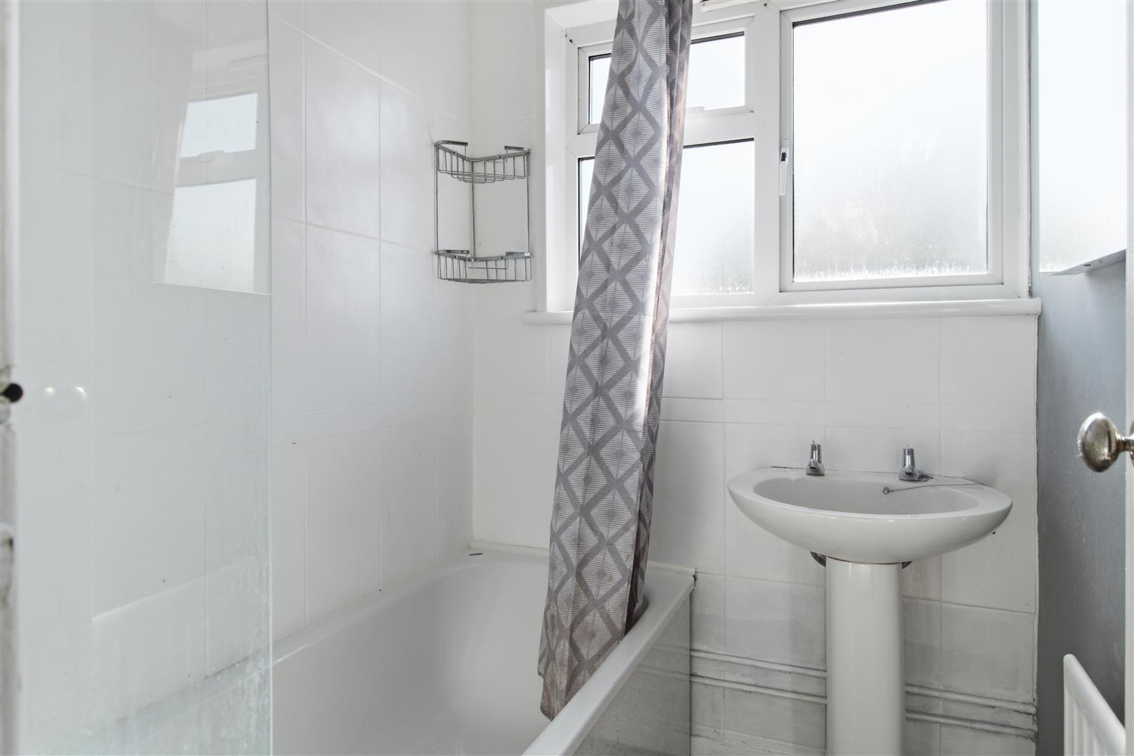 Bath with electric shower above. Pedestal wash basin. Radiator. Vanity mirror with shaver point. Window to the rear. Part tiled walls. Radiator.
