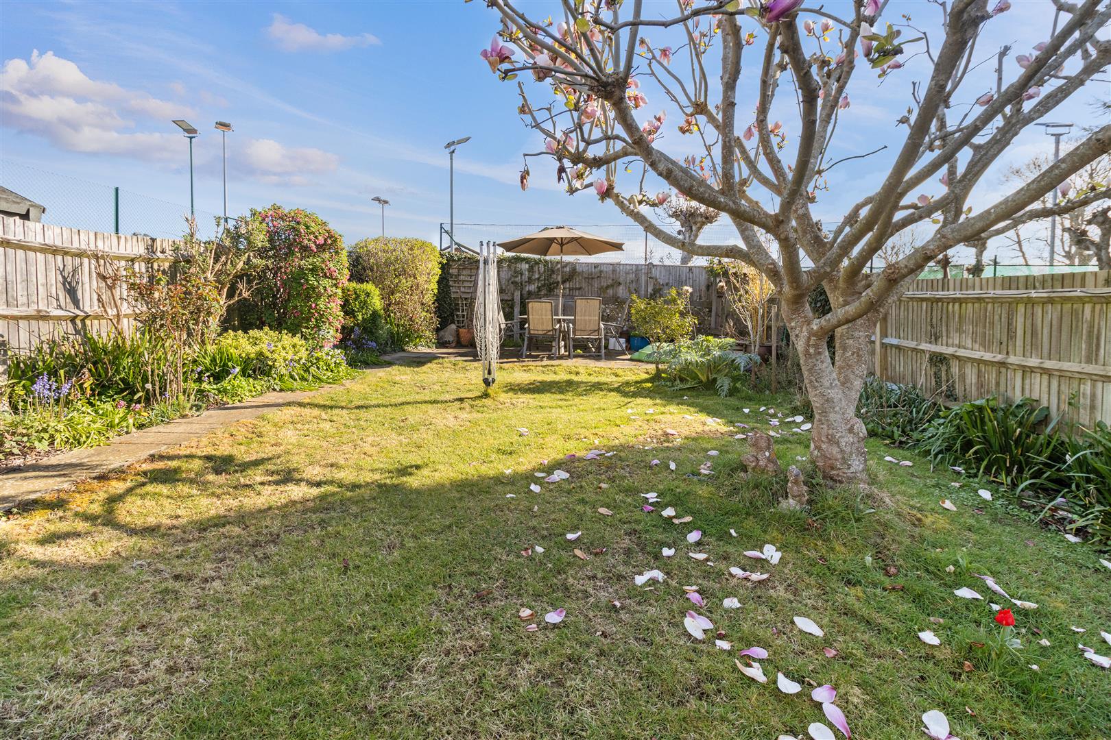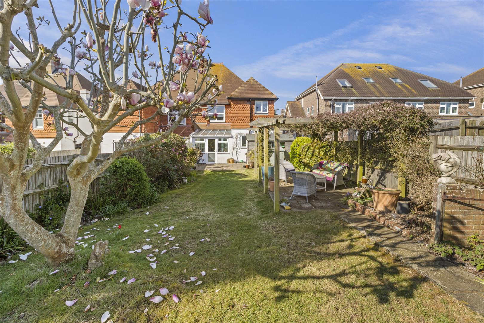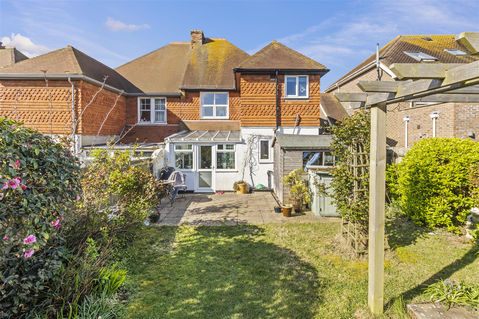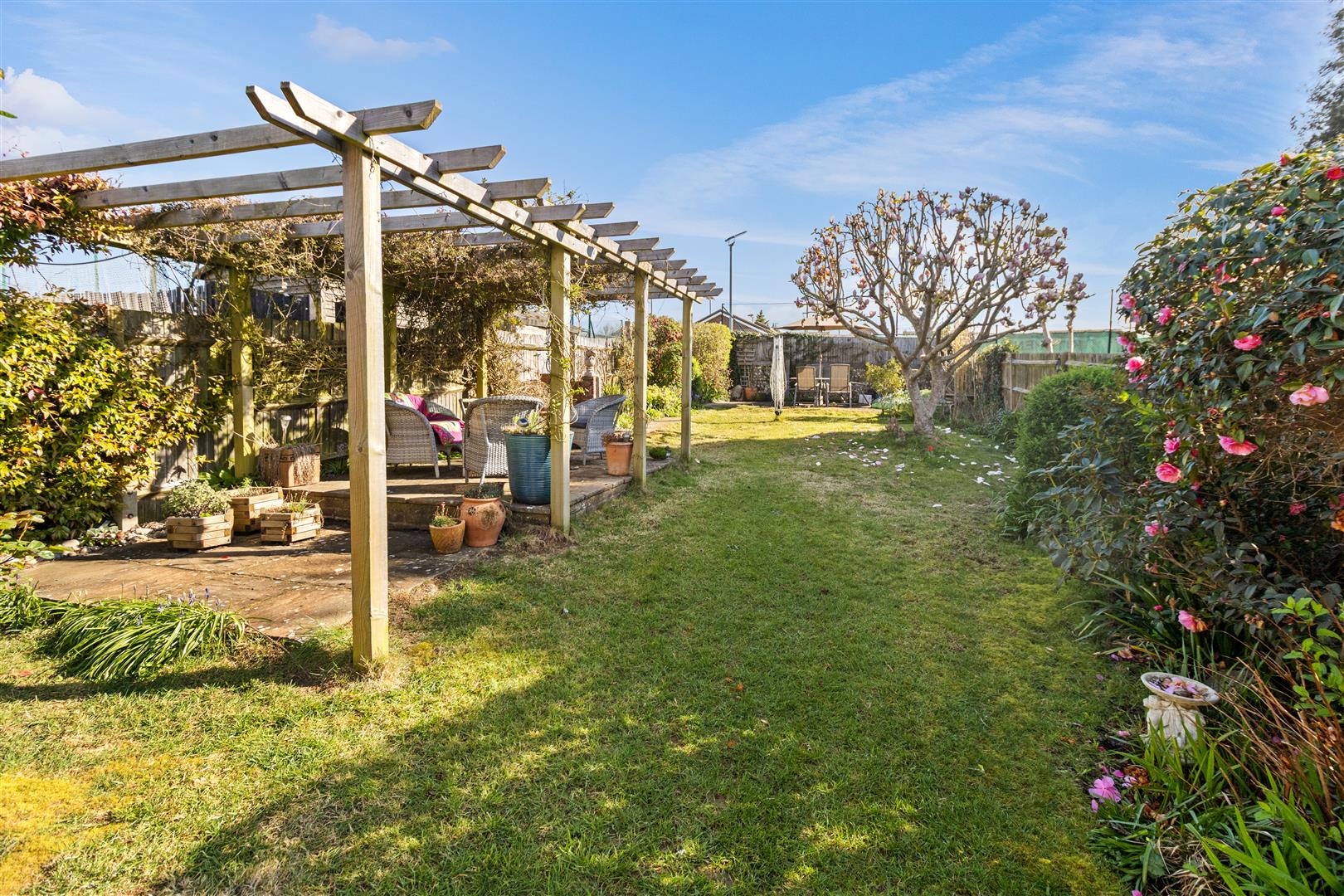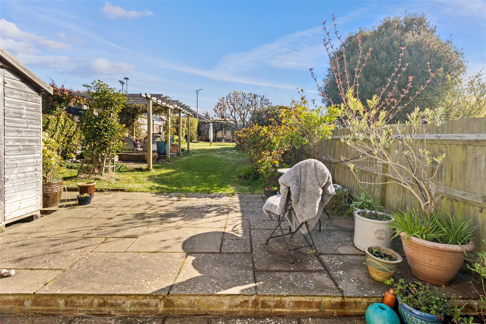 Patio with gated side access to front. Majority laid to lawn with further patio space with pergola above. Exterior tap. Shrub and flower planting. Timber shed.