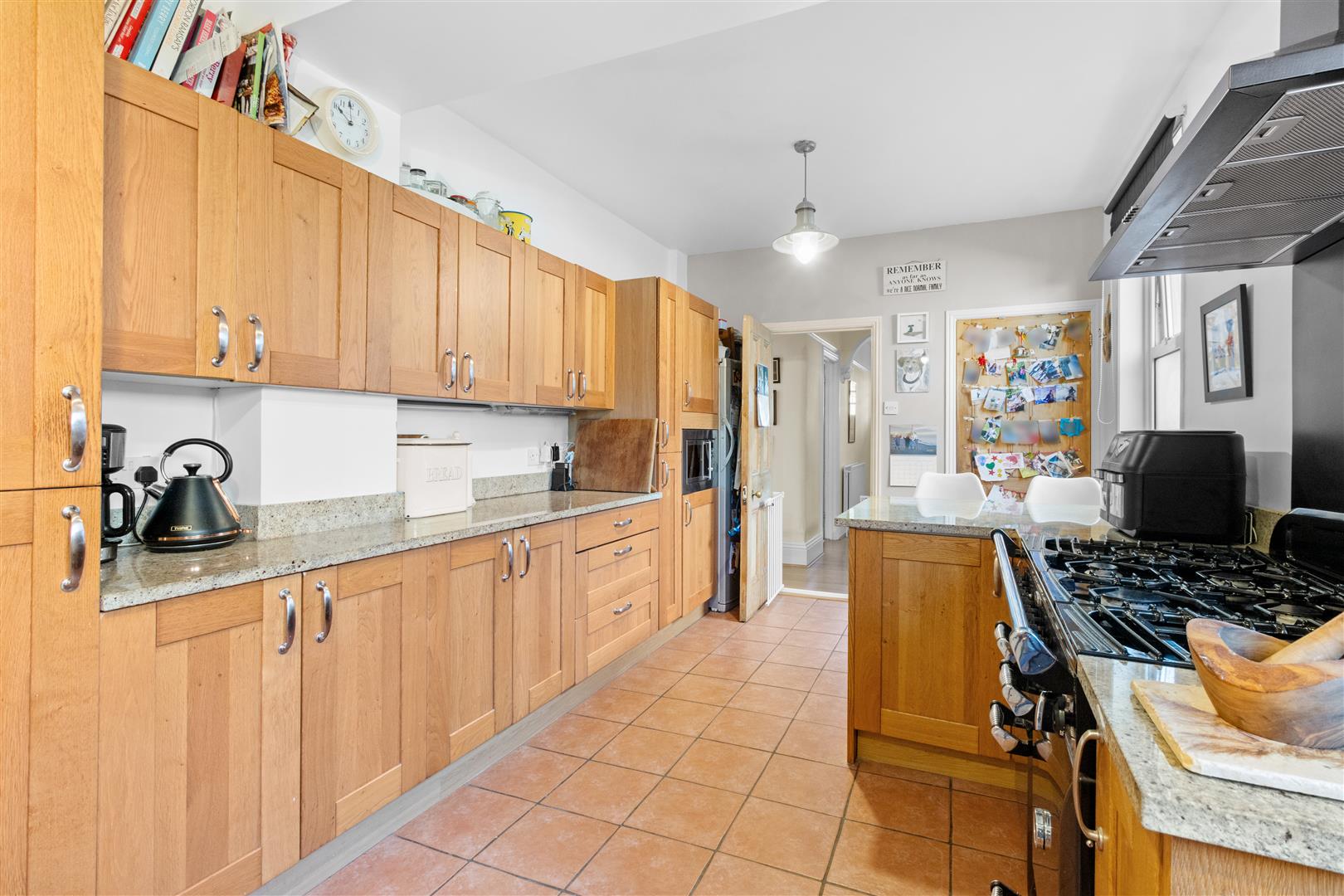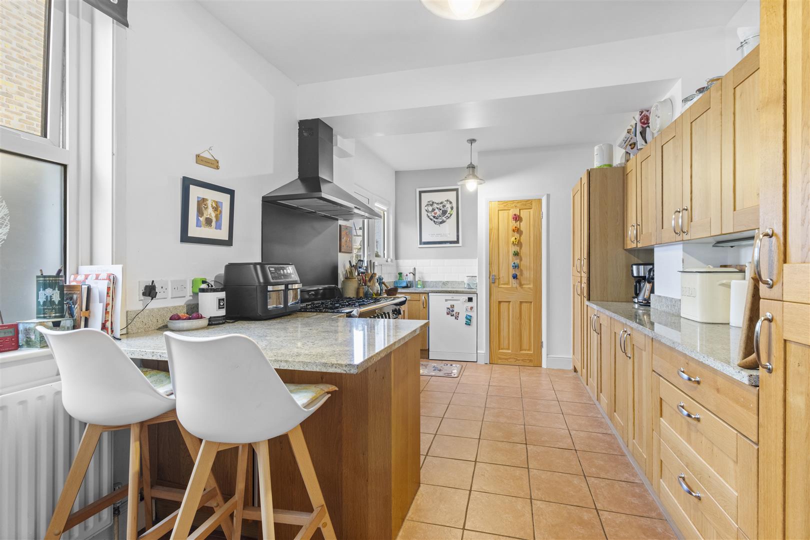 Tiled floor. Wall and base units. Worktop with sink. Space for range-style cooker with cooker hood above. Integrated fridge. Space for upright fridge freezer and dishwasher. Housing for microwave. Double glazed window and door to side. Radiator. Cupboard housing Vaillant gas-fired boiler. Single glazed window.