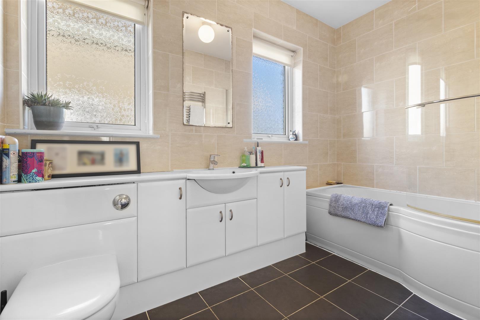 White suite comprising P-shaped bath, wash basin set into a vanity unit and close-coupled WC. Two double glazed windows. Tiled walls. Towel rail.