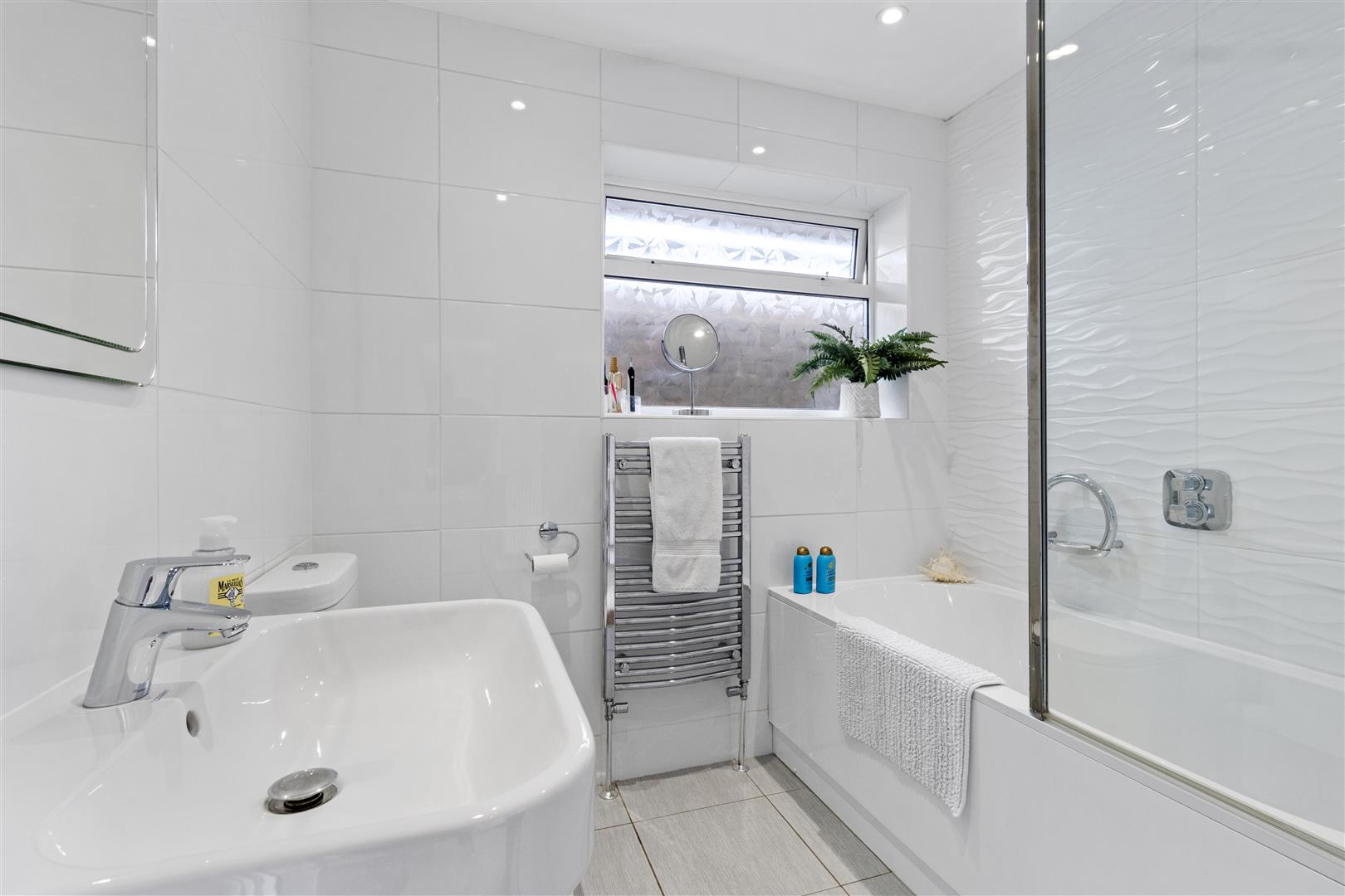 White suite comprising close couple wc, wall mounted wash basin with storage below and mirror above. Bath with shower above. Tiled walls and floor. Towel rail. Double glazed window to side and extractor fan.