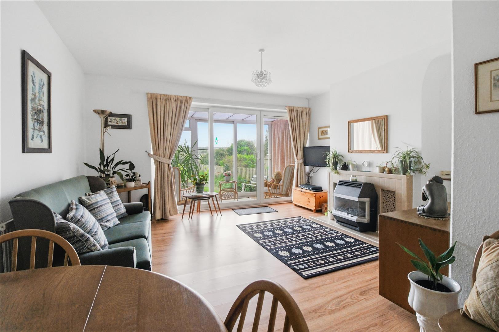 Double glazed patio door to conservatory. Gas fire with back boiler. Tiled hearth. Arch to: