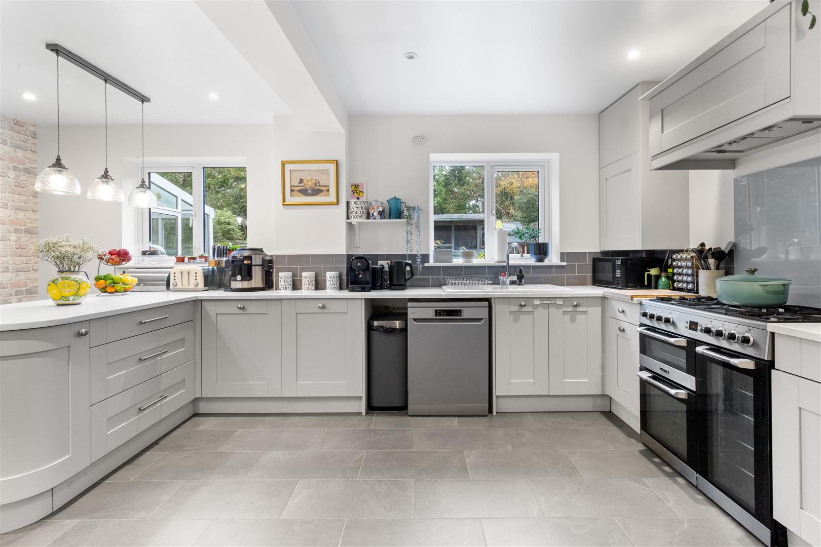 Range of wall and base units. Work surface with inset one and a half sink and drainer. Space for Range style gas cooker, fridge freezer and dish washer. Worcester-Bosch gas fired boiler. Cooker hood. Tiled floor and towel rail. Double glazed windows overlooking rear garden and door to side. Door to: