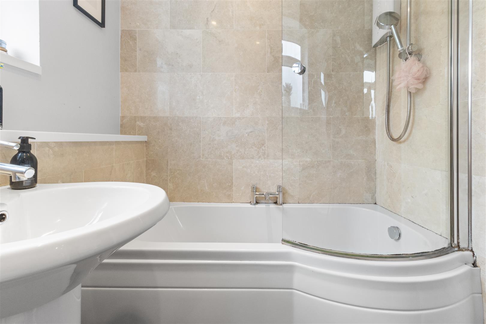 P shaped bath with electric Mira shower above. Pedestal wash basin. Close coupled wc. Part tiled wallls and tiled floor. Double glazed window.