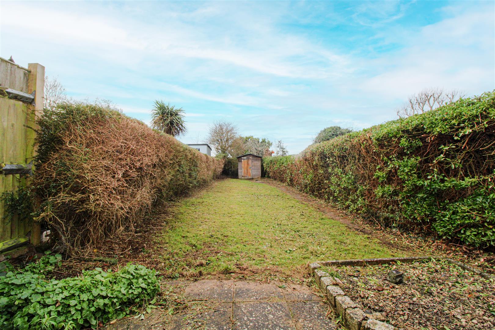 Steps down from the kitchen to patio. Area laid to lawn with hedge boarders. Timber shed. Gated access to front.