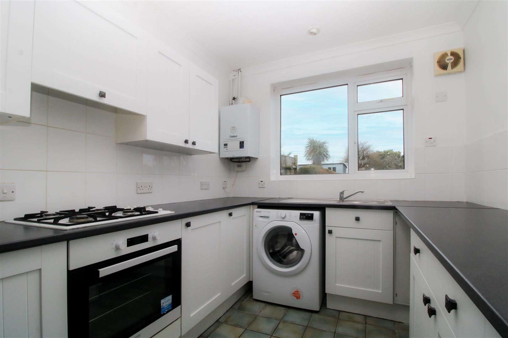 Range of wall and base units. Work surface with four ring gas hob with electric oven below and cooker hood above. Space for upright fridge freezer and washing machine. Vaillant gas fired boiler. Opening to store with double glazed door to rear.