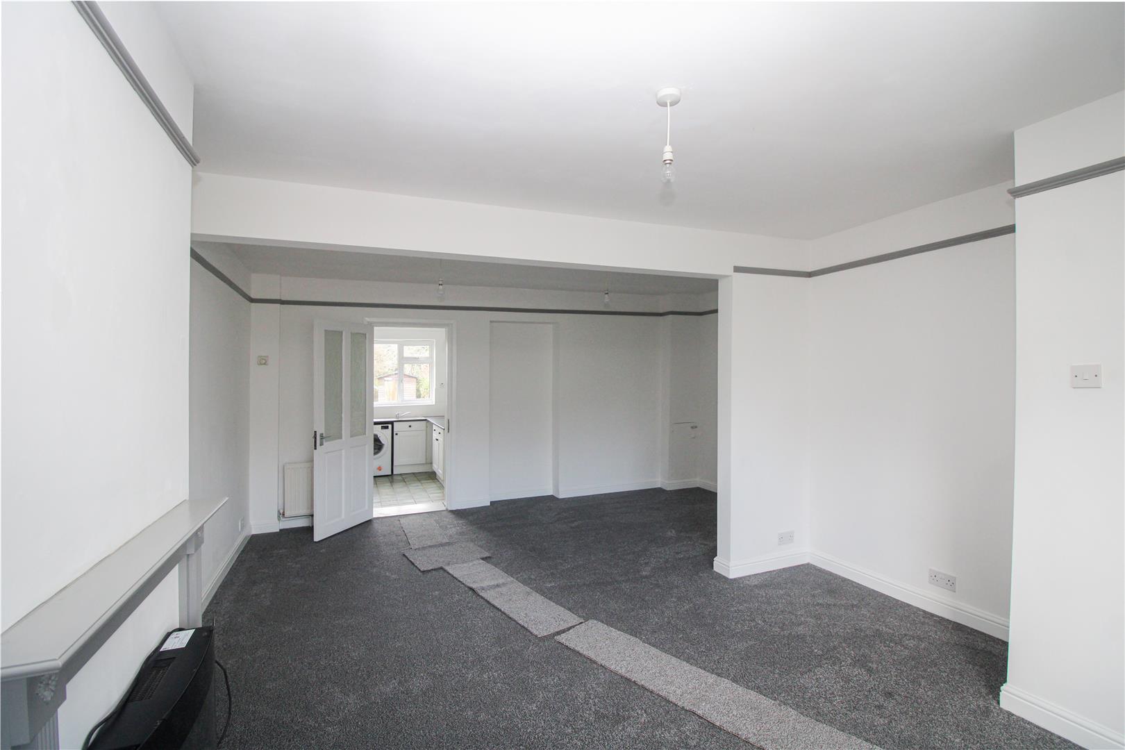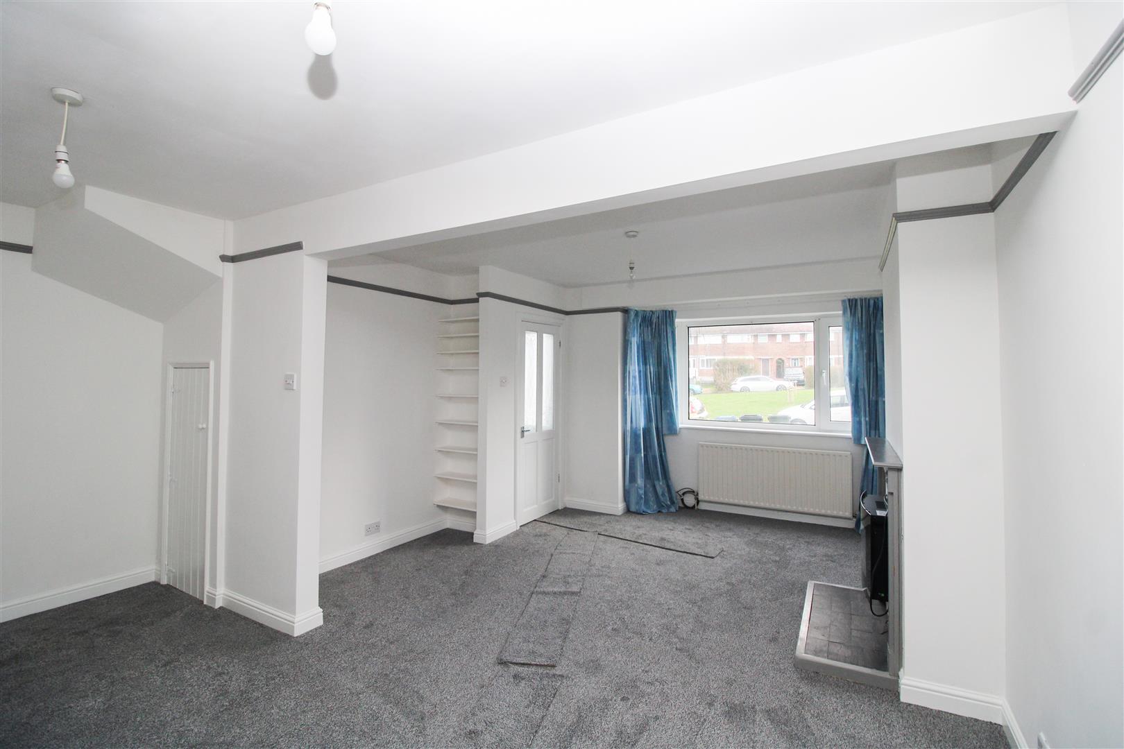 Two radiators. Double glazed window to front. Electric fireplace with decorative surround. Fitted shelfing and under stairs storage cupboard with single glazed window.