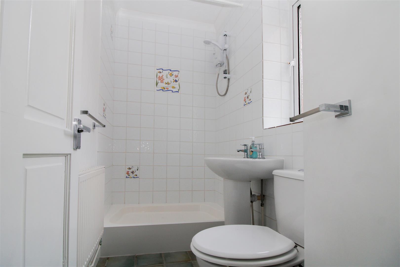 Double glazed window to side. Triton wall mounted electric shower and shower tray. Pedestal wash basin. Close coupled WC. Part tiled walls and tiled floor. Extractor fan.