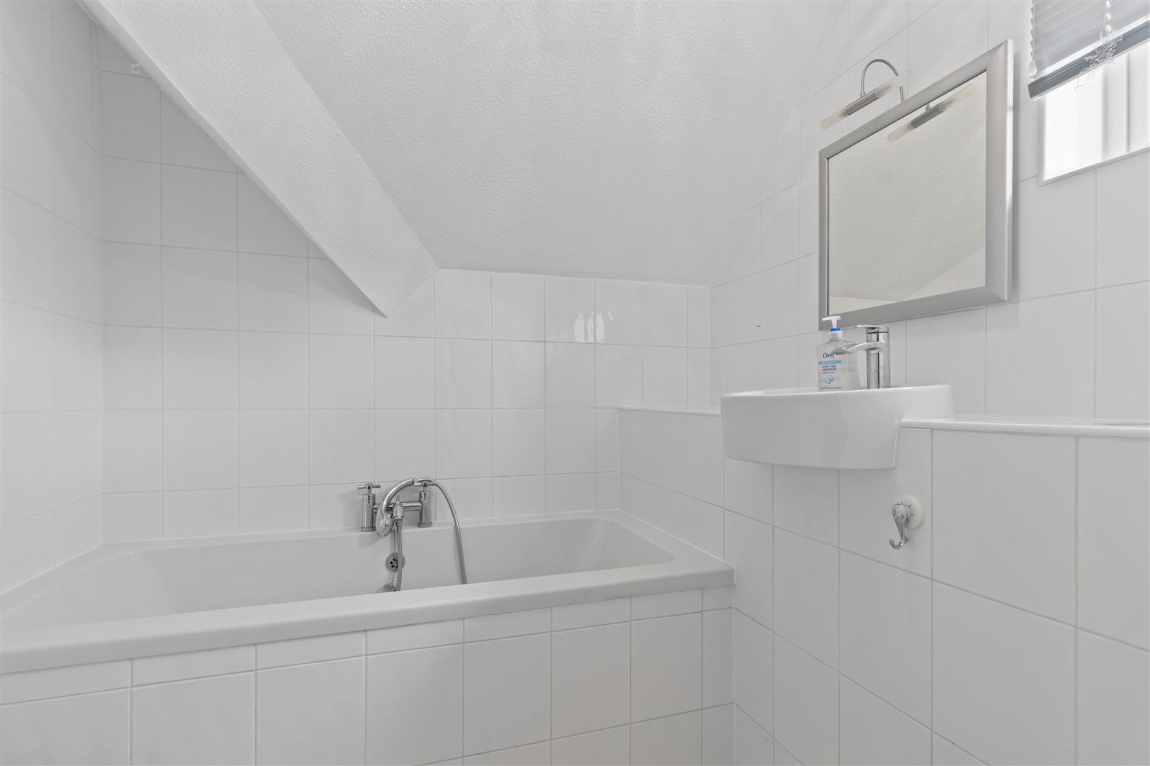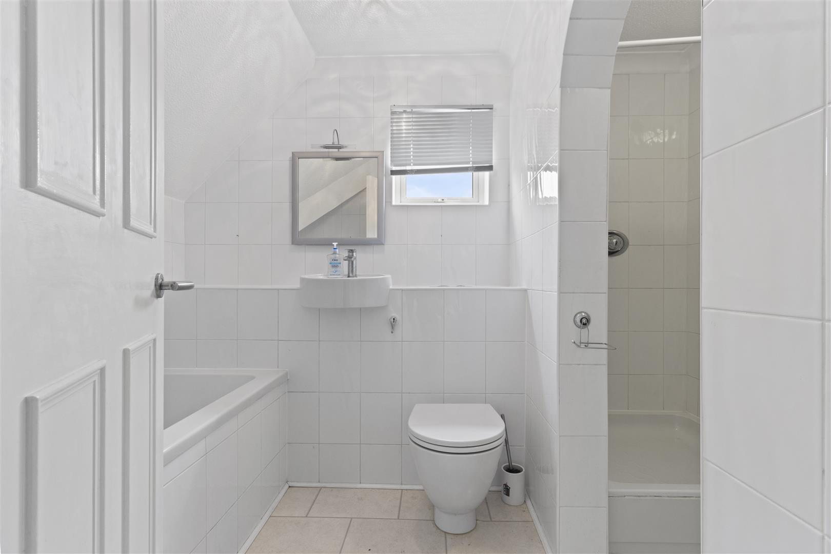 Stylishly finished with a full suite: bathtub, circular hand basin, concealed WC, and separate shower cubicle. Fully tiled walls and floor for a clean, contemporary finish.