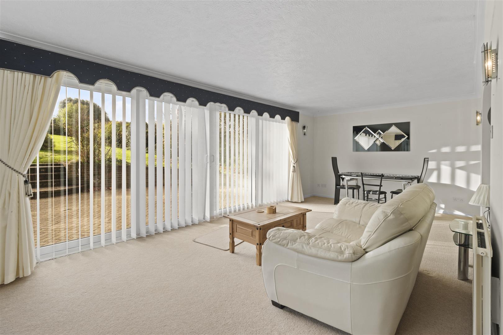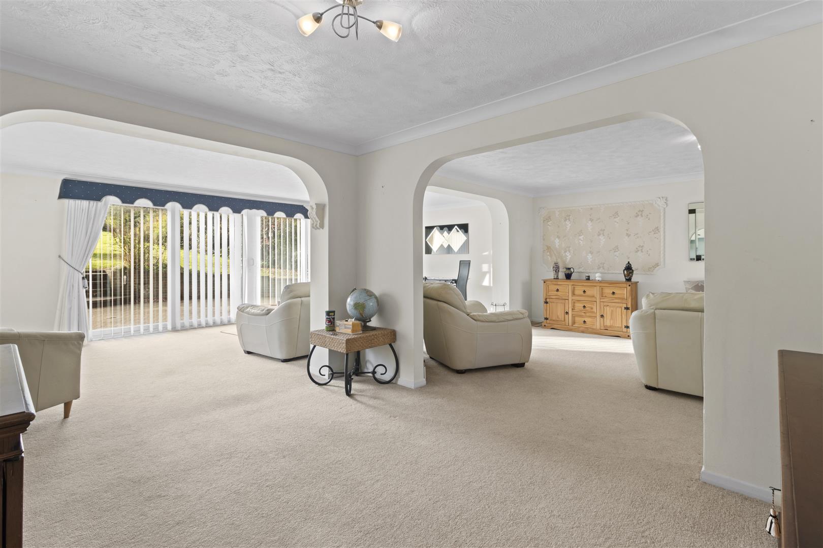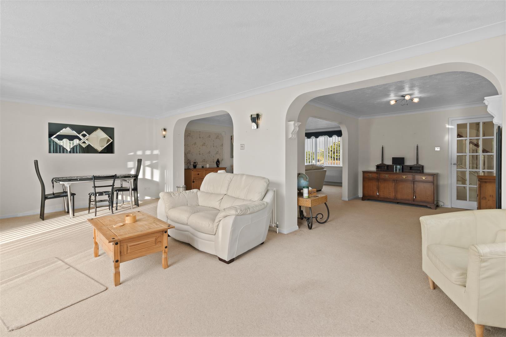 An ideal open-plan family space with triple-aspect light, including front, side, and rear windows. Three graceful archways add character and definition, while UPVC double-glazed sliding doors open directly to a tiled patio and extensive lawn, with magnificent views of the Downs.