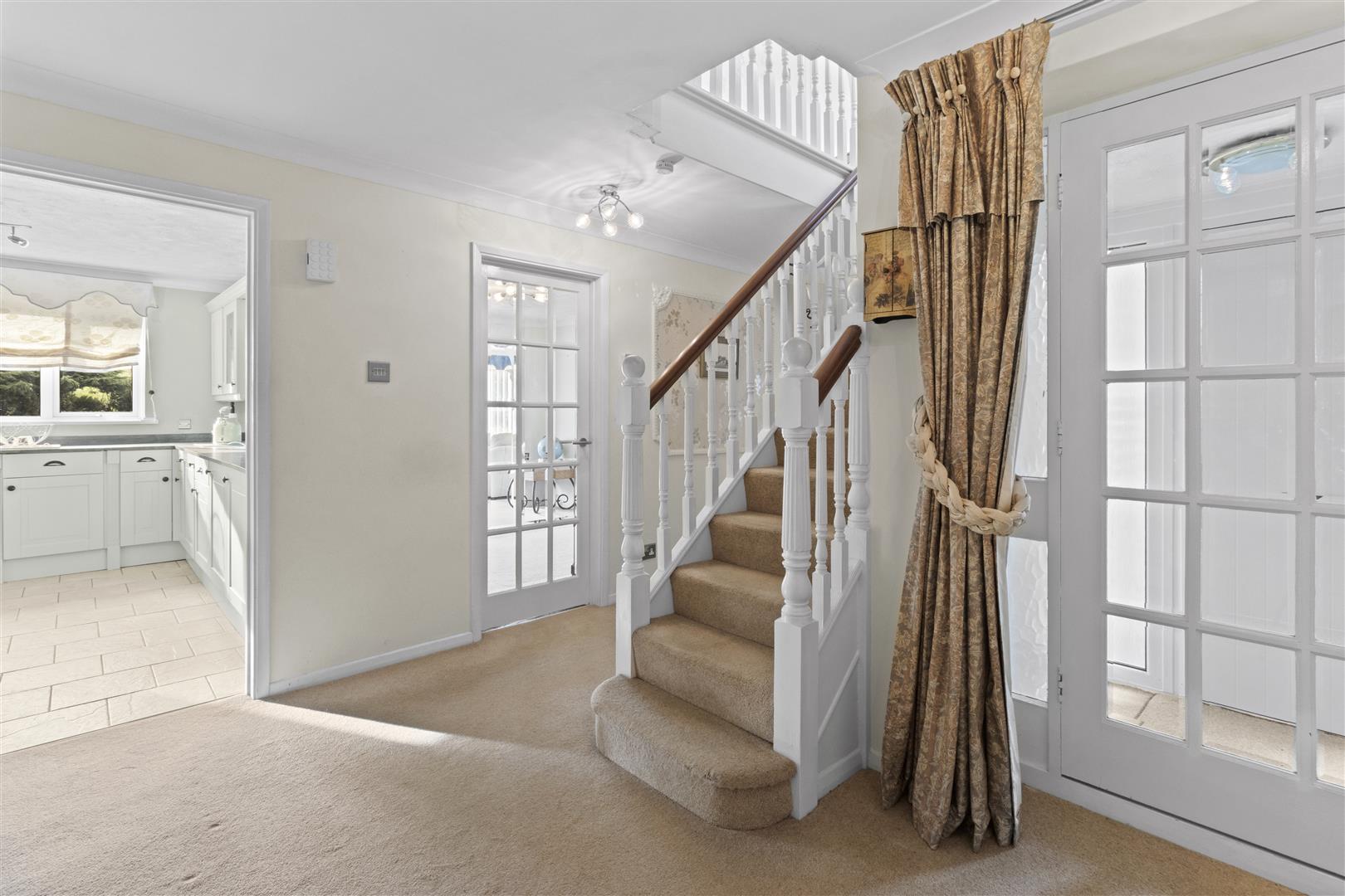 Entrance porch into a bright and spacious reception hall, featuring under-stairs storage, classic-style detailing, and a central balustrade staircase. Internal access is provided to the double garage.